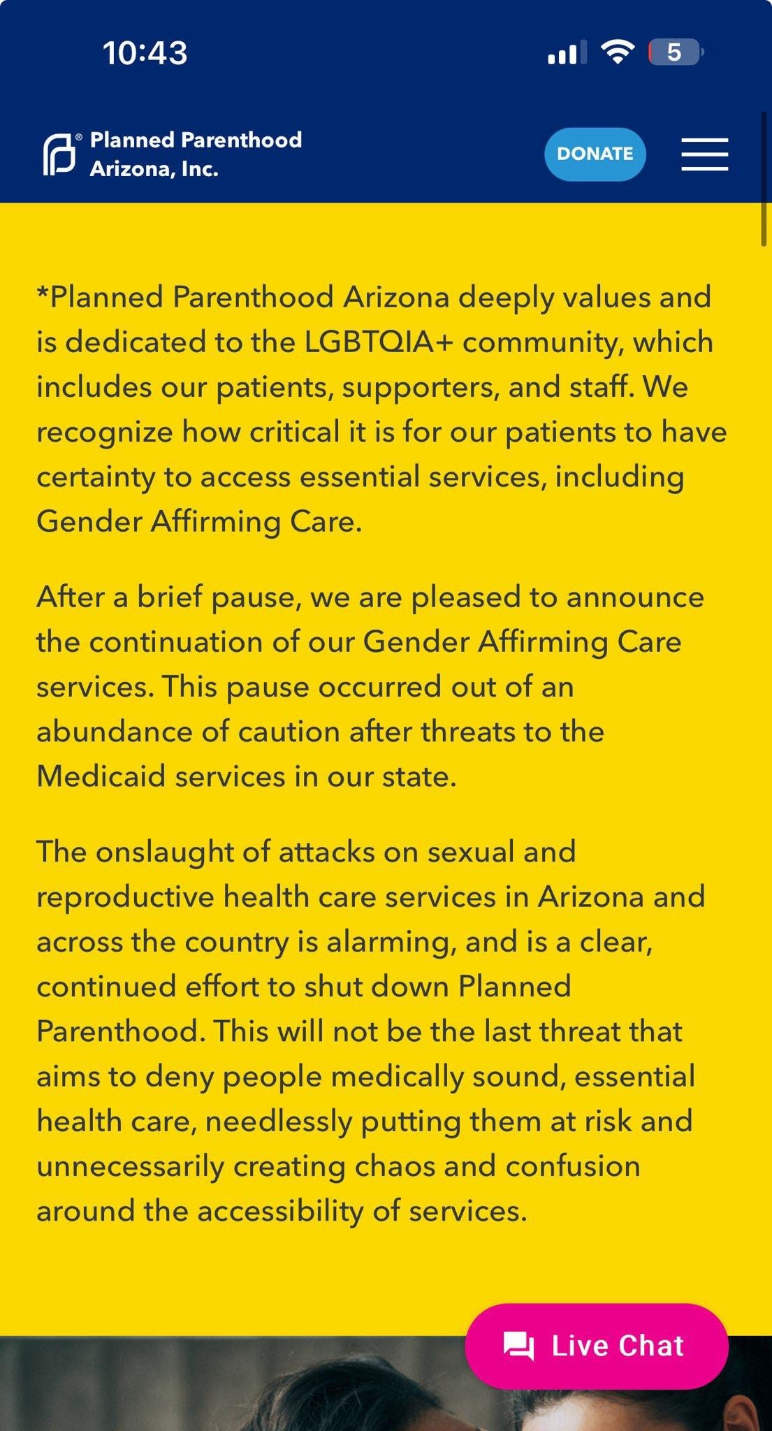 “Planned Parenthood Arizona deeply values and is dedicated to the LGBTQIA+ community, which includes our patients, supporters, and staff. We recognize how critical it is for our patients to have certainty to access essential services, including Gender Affirming Care.