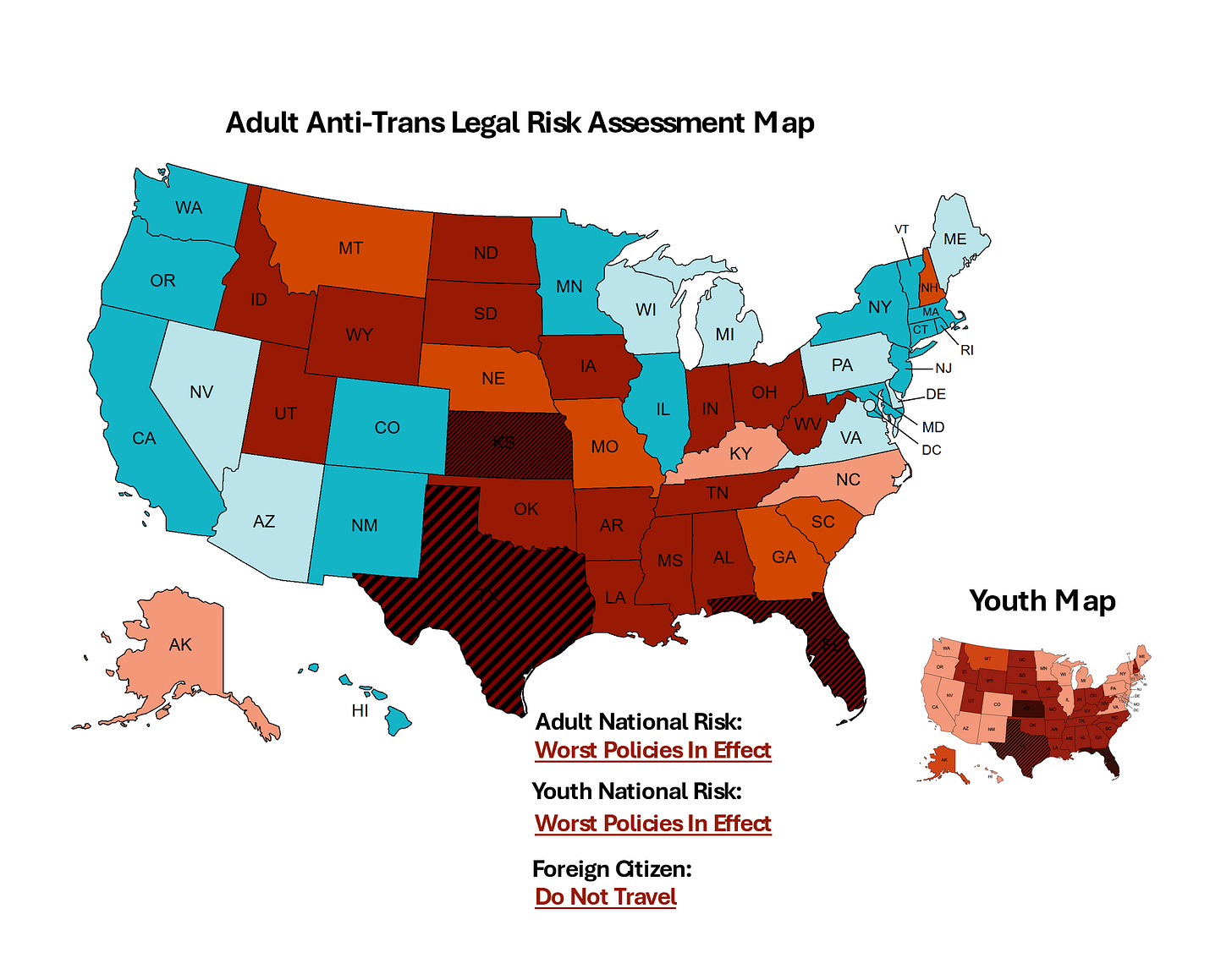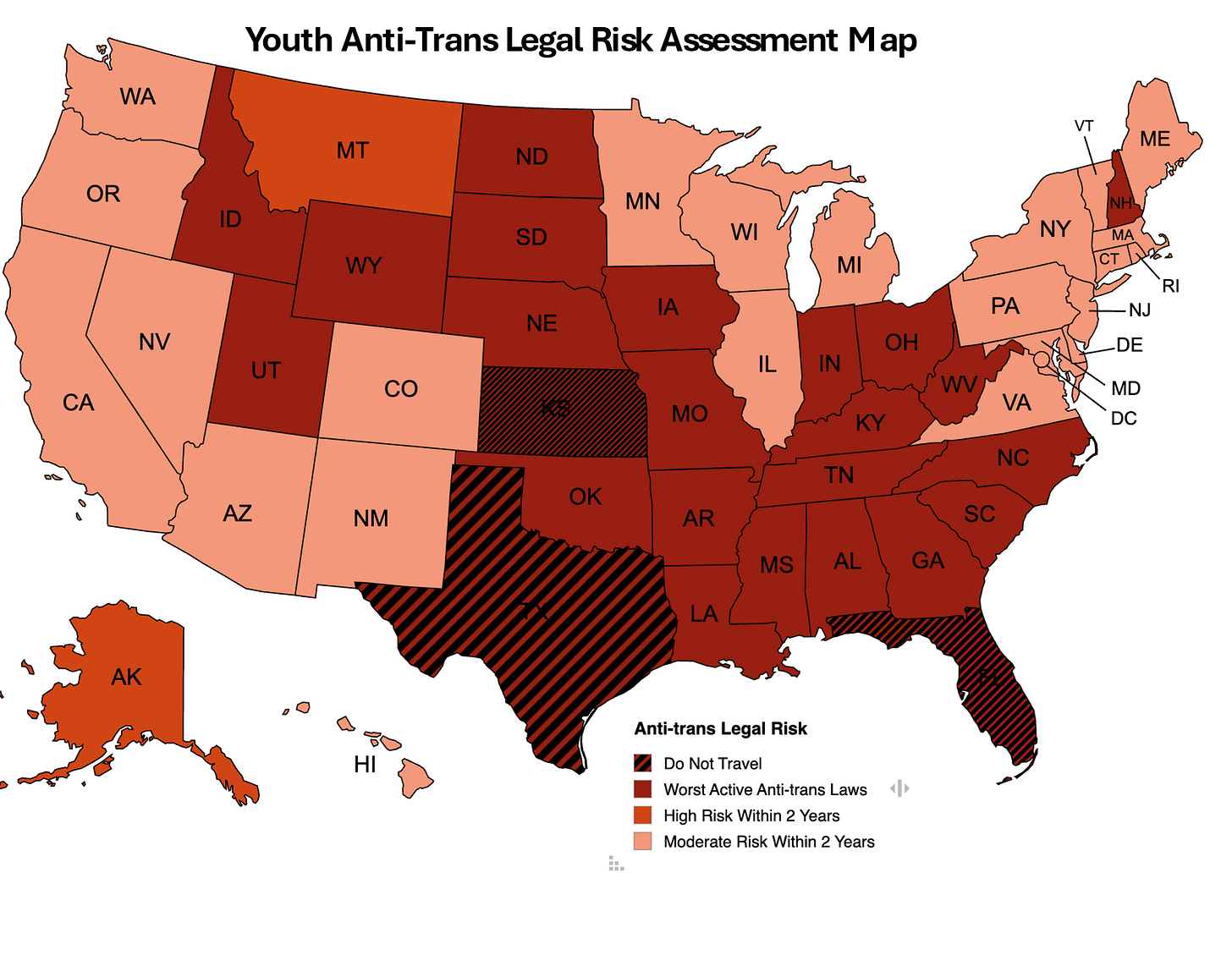 Short summary of updates: The situation continues to deteriorate for transgender youth care, and the risk profile for adults has shifted as well, with Kansas now added to the “do not travel” category. For adults, expanding bathroom bans are driving much of the change—Kansas has escalated due to establishing a bathroom bounty, while Indiana’s ID policy now places it among the harshest anti-trans states in the country. One state improves: Montana, where the state court system has repeatedly blocked or enjoined anti-trans laws under the state constitution. For transgender youth, however, the national picture has grown more unstable. Federal policy shifts, institutional capitulations, and ongoing legal battles have created a volatile patchwork even in states once considered protective. Rather than attempt to track an effectively real-time capitulation crisis, I have elevated every state previously rated below “moderate” to at least moderate risk. In the current environment, no state can reasonably be considered low risk for transgender youth.