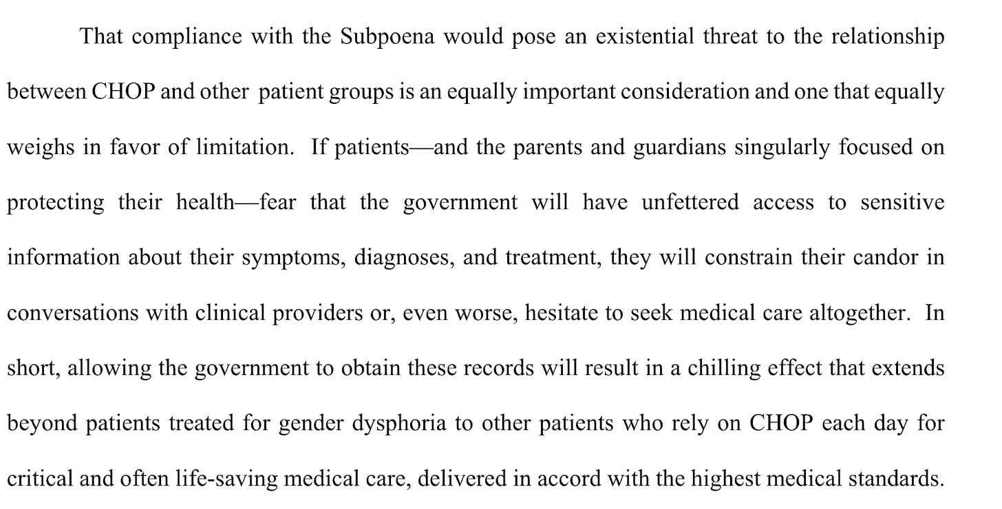 CHOP, like BCH, is fighting the most dangerous parts of the subpoena. In a July court filing, they denounced the DOJ’s efforts as an attack not just on trans patients, but all patients: