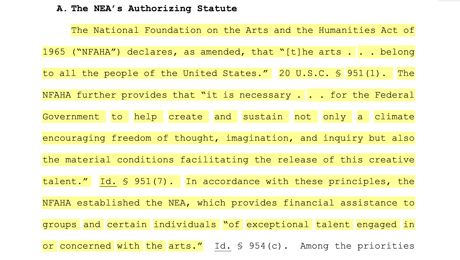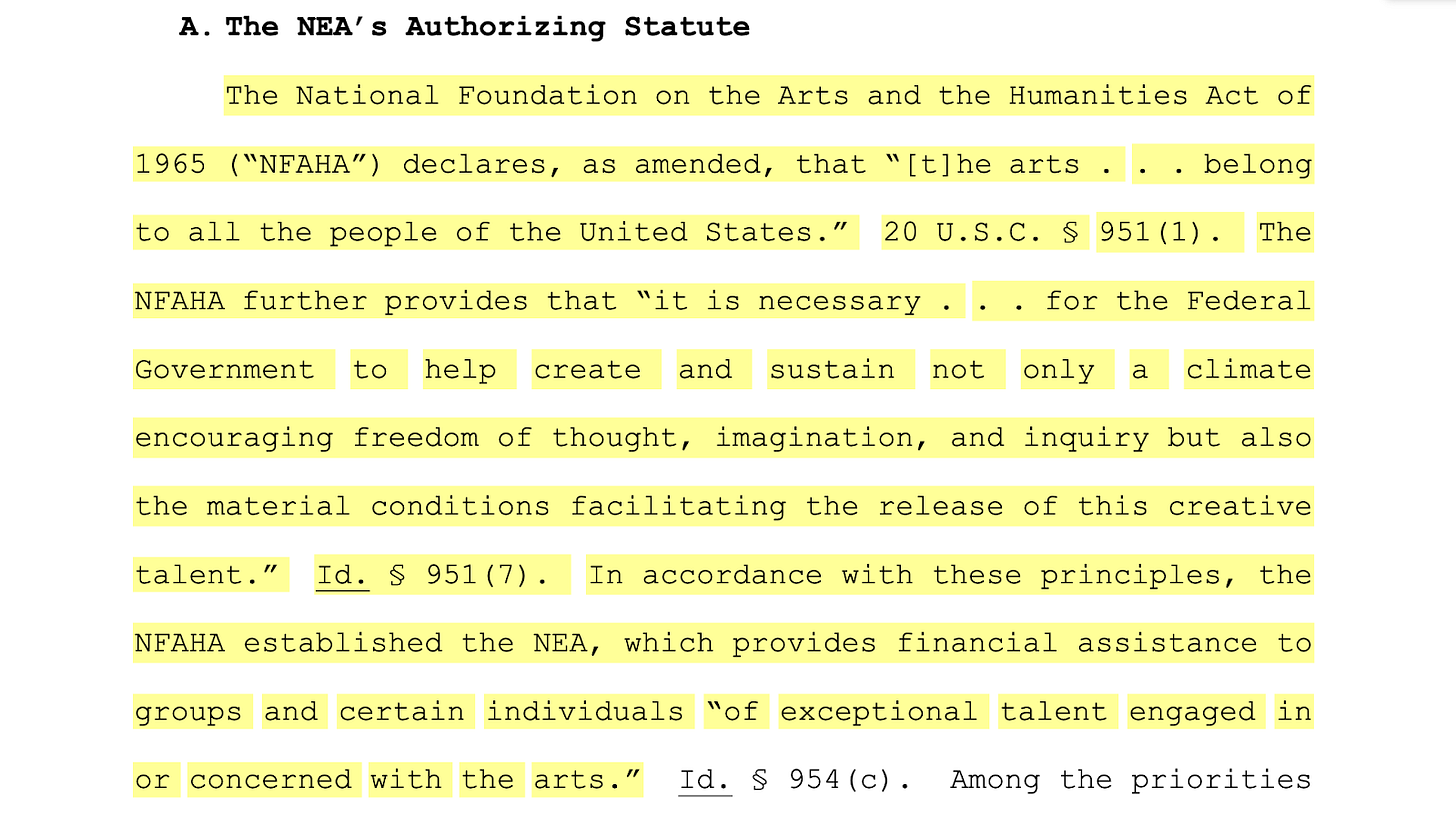 The National Endowment for the Arts is an independent agency created by Congress to fund and shepherd great American art. The problem seems to be that Trump wants the agency to discriminate against artists who do not focus on straight, cisgender white men—prioritizing political virtue signaling over actual merit and talent, and stymieing the free marketplace of ideas to advance his political agenda.