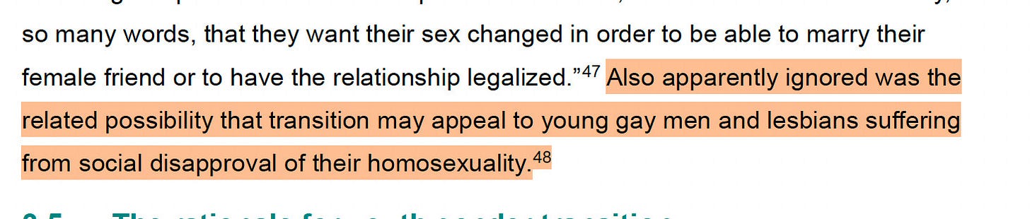 The claim that transgender people are “actually just gay” is one that has been made repeatedly by those opposed to gender affirming care, and one that has been repeatedly debunked. The claim is that people transition for “social acceptance,” a claim that stretches credulity given differential acceptance of gay and transgender people.