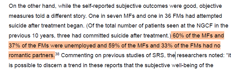Anti-transgender activists have long struggled to rebut the high satisfaction rates reported by those who receive gender-affirming care, and the authors of this report are no exception. Unable to discredit those numbers directly, the reviewer pivots instead—arguing that satisfaction is irrelevant because, “objectively,” transgender people are doing “poorly.” The evidence? A single 1988 study—nearly 40 years old—claiming that 60% of male-to-female and 37% of female-to-male transitioners were unemployed, and many lacked romantic partners. These are held up as “objective measures.”