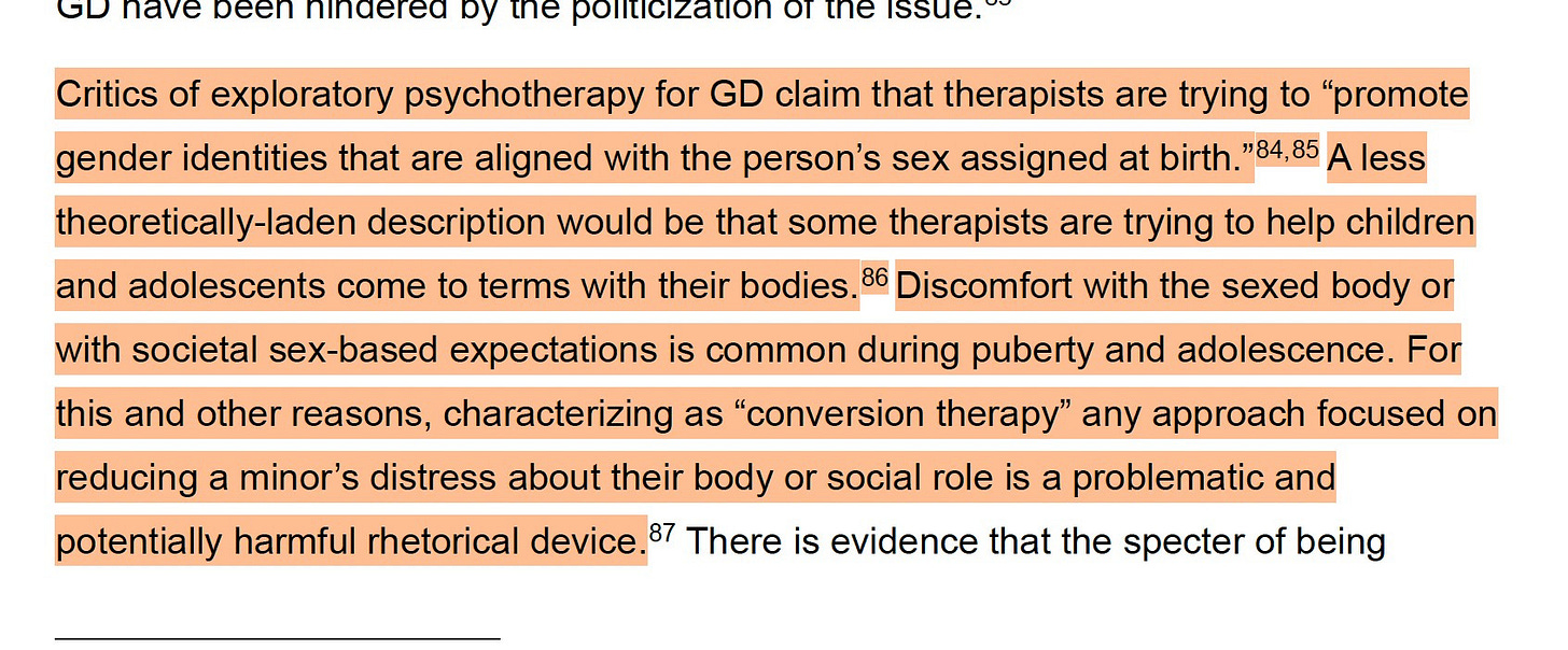 The review flounders when attempting to present viable alternatives to gender-affirming care—chief among them, psychotherapy. There is no comprehensive evidence that talk therapy alone can treat gender dysphoria. On the contrary, the documented harms of conversion therapy are extensive: LGBTQ+ youth subjected to it are more than 2.5 times as likely to report multiple suicide attempts in the past year. The report attempts to have it both ways—insisting that psychotherapy for gender dysphoria isn’t conversion therapy, while also suggesting, in the same breath, that conversion therapy (“psychotherapy” or “psychiatric care” in the report) might actually be effective in curing gender dysphoria.