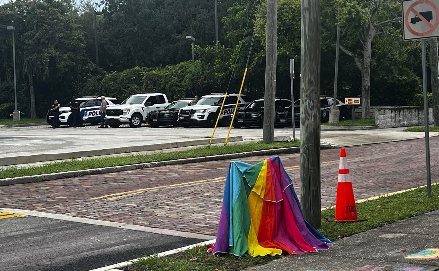 A war over crosswalks is erupting in Florida. After statewide efforts to erase Pride crosswalks began this week, communities have resisted—repainting them, fighting attempts to strip them, and in some cases, restoring rainbow colors overnight. Nowhere is this battle more symbolic than at the Pulse memorial in Orlando, dedicated to the LGBTQ+ people murdered there a decade ago. Earlier this week, officers painted the rainbow stripes into stark black and white. Citizens repainted them. Road crews erased them again. The back-and-forth has escalated to the point where the state has now deployed as many as six police squad cars to guard asphalt, their sole mission to prevent the reemergence of rainbow colors at the site of one of the worst anti-LGBTQ+ massacres in U.S. history.
