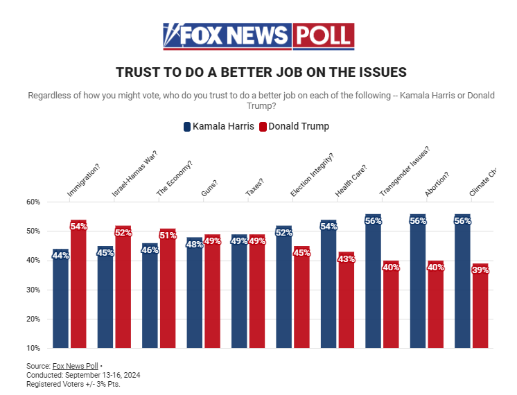 When voters were asked whom they trust to handle transgender issues, Harris leads Trump by 16 points. This margin mirrors her lead on abortion and is just slightly behind her advantage on climate change, where she performs best. Harris’s lead on transgender issues suggests that highlighting this topic in the election may backfire for Trump, potentially weakening his chances the more Republicans push the issue to the forefront.