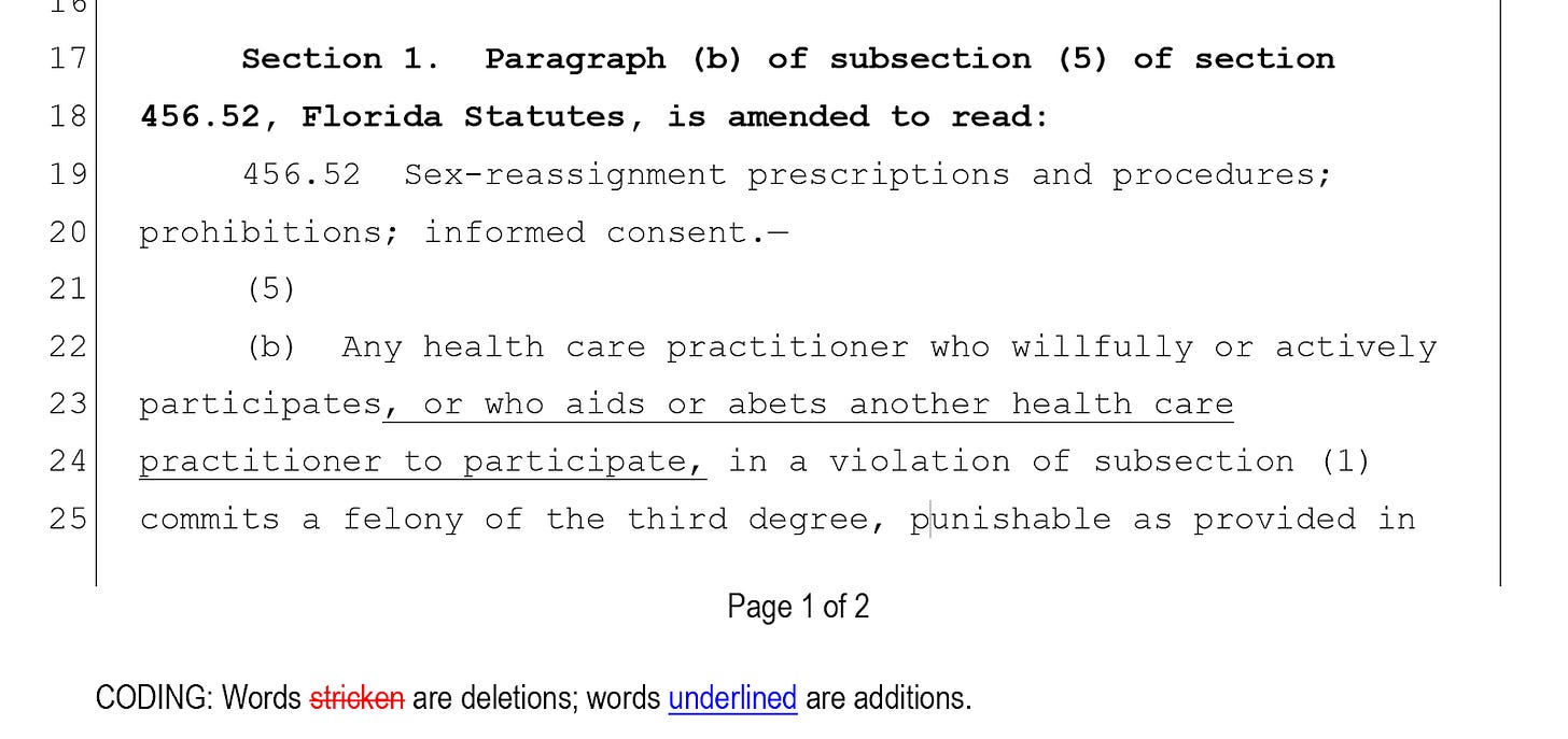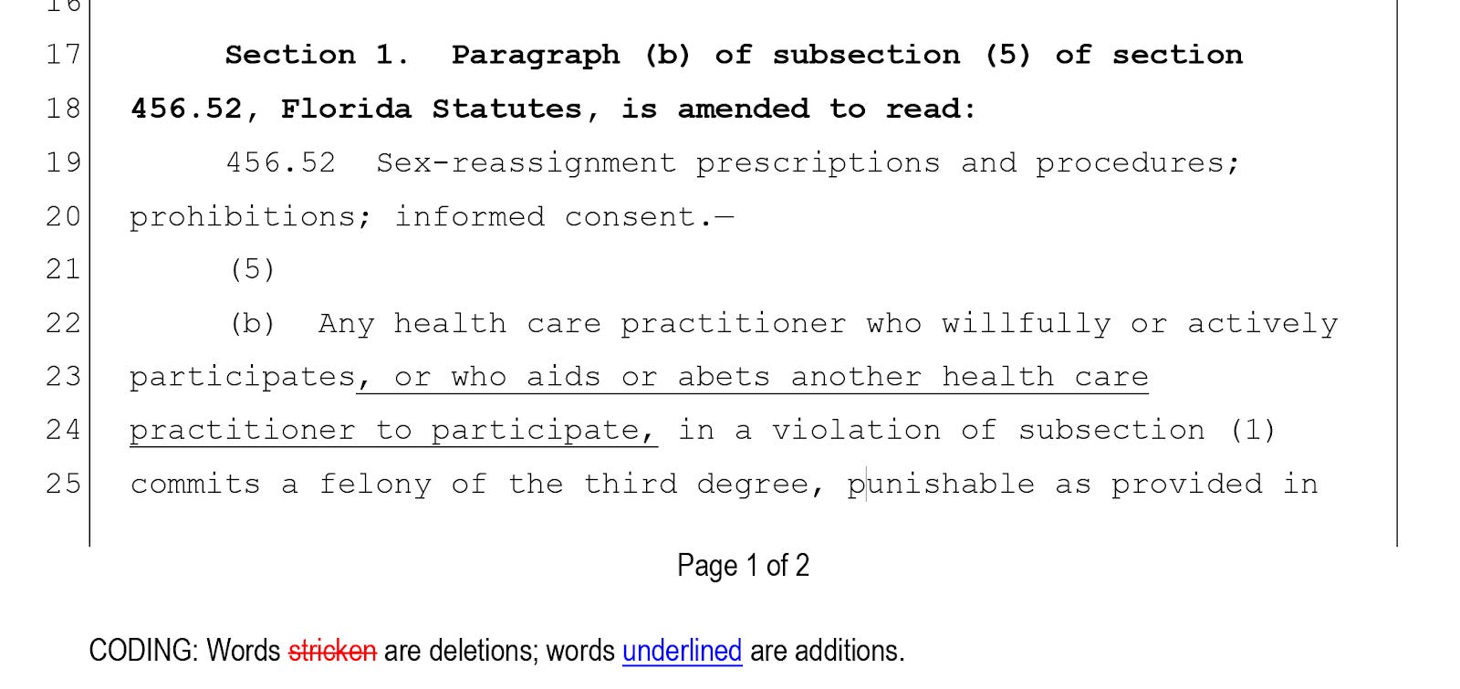 Florida law now requires that gender-affirming care be provided only by a physician, in-person, with a signed consent form. This strips nurse practitioners and telehealth providers of their ability to offer such care.