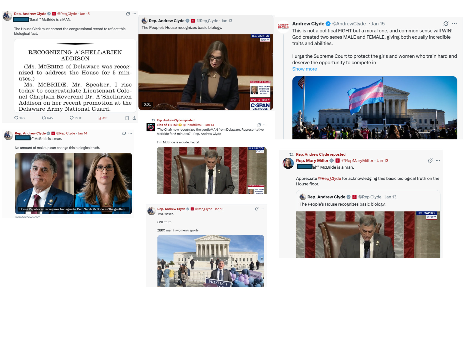 She left the podium without incident and did not reply to the Speaker’s comment. In turn, the congressman has either posted or reposted transphobic content about Sarah McBride half a dozen times since the seconds-long incident went down on Jan. 13.
