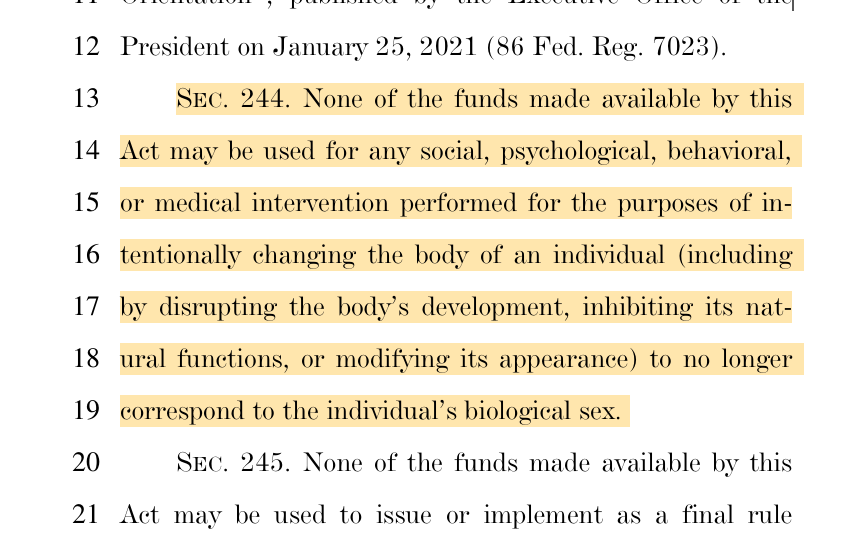 “None of the funds made available by this Act may be used for any social, psychological, behavioral, or medical intervention performed for the purposes of intentionally changing the body of an individual (including by disrupting the body’s development, inhibiting its natural functions, or modifying its appearance) to no longer correspond to the individual’s biological sex,” reads the provision.