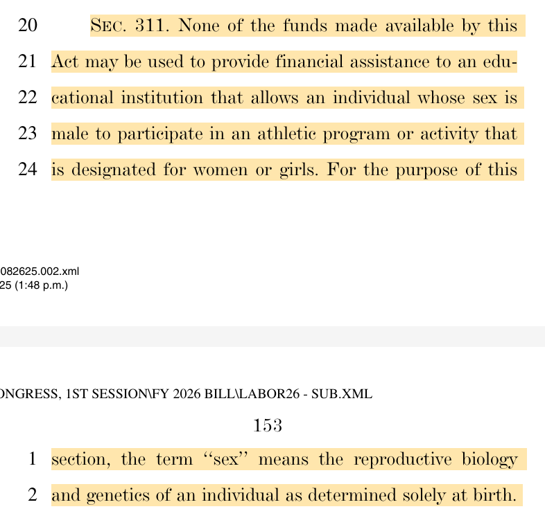 These are not the only provisions in the appropriations bill targeting transgender people. Another section stipulates that any educational institution receiving federal funding could lose that funding if it allows transgender female students to participate in “athletic programs or activities designated for women or girls.” Such language would function as a de facto national transgender sports ban, forcing schools and universities into compliance. Even more troubling, the vague use of the word “activity” could give the administration sweeping latitude to strong-arm schools into broader restrictions—potentially extending to bathrooms, dorms, and virtually any gendered program or event, even if it may not be fully supported by some readings of the text.
