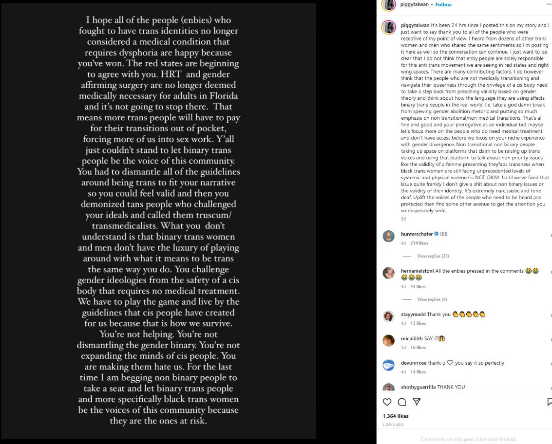 And as for Schafer - addressing this is far more important than cancelling a young trans woman. I know it feels good to jump down Hunter Schafer’s throat - she very easily could have felt swayed by something without knowing the history behind it. But our efforts are much better spent on stopping this transmedicalism as a philosophy. Spend your energy debunking the stuff like what the original post put out because that’s what’s actually hurting us.