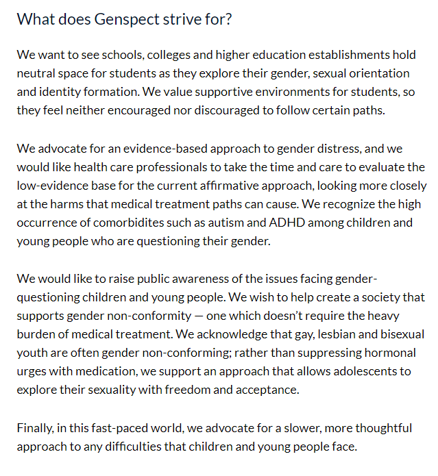 Here is Genspect's mission statement. Again, note the gatekeeping language and the attempt to make being trans about literally anything else but actually being transgender:
