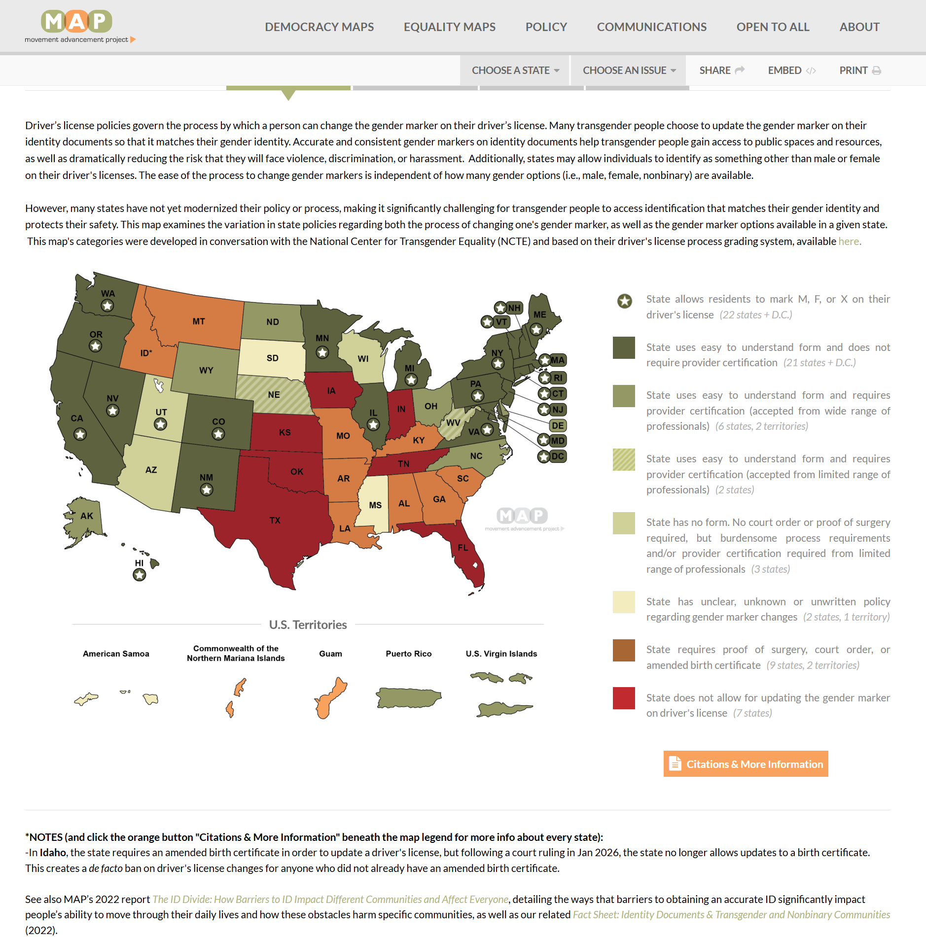 The bill is the latest in a growing wave of anti-transgender identification document laws. In February, Kansas went further than any state before it, invalidating transgender people's driver's licenses overnight and sending letters demanding their immediate surrender—leaving many scrambling and unable to get to work, pick up their children, and navigate daily life with suddenly invalid IDs. Though Mississippi's bill does not contain those instant revocation provisions, the effect will be the same over time: as licenses come up for renewal, transgender Mississippians will be forced to carry documents that out them. According to the Movement Advancement Project, seven states already do not allow transgender people to update the gender marker on their driver's license. If Gov. Reeves signs SB 2322, Mississippi will become the eighth.