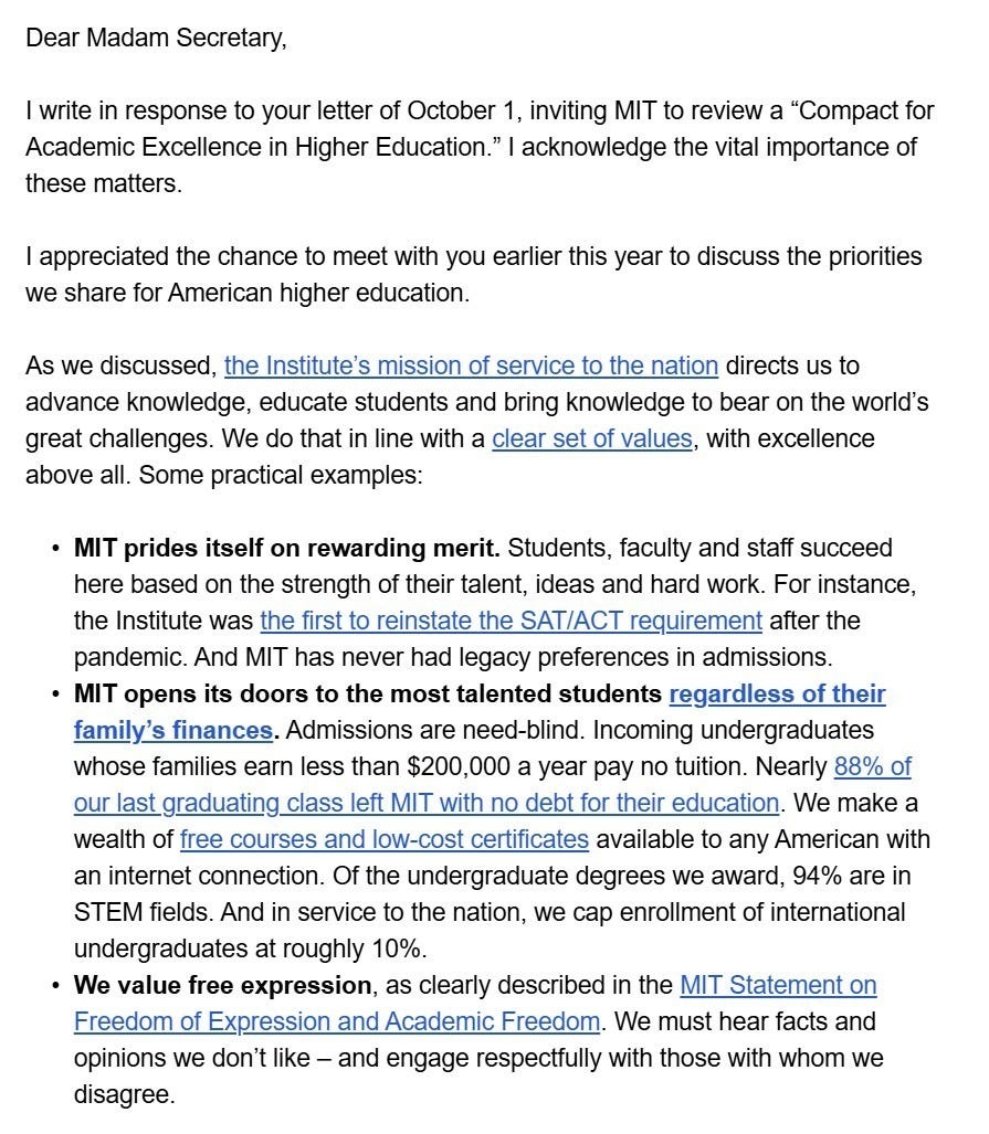 “The premise of the document is inconsistent with our core belief that scientific funding should be based on scientific merit alone,” said MIT President Sally Kornbluth, in a letter sent to the Department of Education and released to the public earlier today. This makes MIT the first university to publicly reject Trump’s Compact.