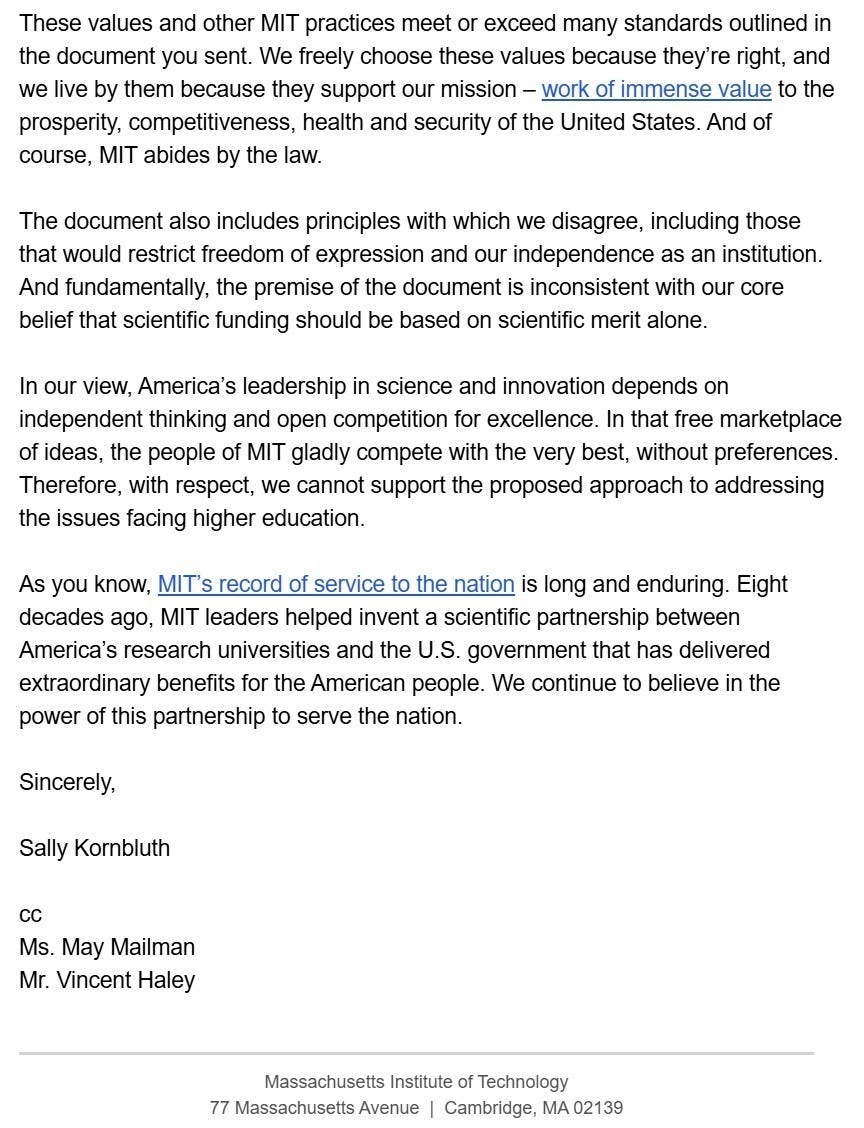 “In that free marketplace of ideas, the people of MIT gladly compete with the very best, without preferences. Therefore, with respect, we cannot support the proposed approach to addressing the issues facing higher education,” Kornbluth said.