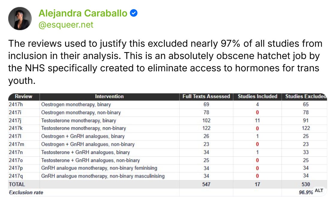 On Monday, NHS England published 10 evidence reviews purporting to show that the quality of evidence for hormone therapy for transgender youth is low. The reviews were released alongside an announcement that the healthcare system would be banning new hormone prescriptions for transgender youth under the age of 18. But upon closer examination, the evidence reviews appear to be an extreme example of politically-manufactured science—similar to other reviews that have come out of the UK in recent months to provide political justification for banning gender-affirming care. Across the 10 reviews, 547 full-text screenings resulted in just 17 studies included—a staggering 97% exclusion rate. The reviews used exclusion criteria designed to guarantee that result, discarded some of the most significant transgender care studies published in the last decade for nonsensical reasons, and then reached what appears to be a predetermined conclusion: that there is insufficient evidence that hormone therapy for trans youth works.
