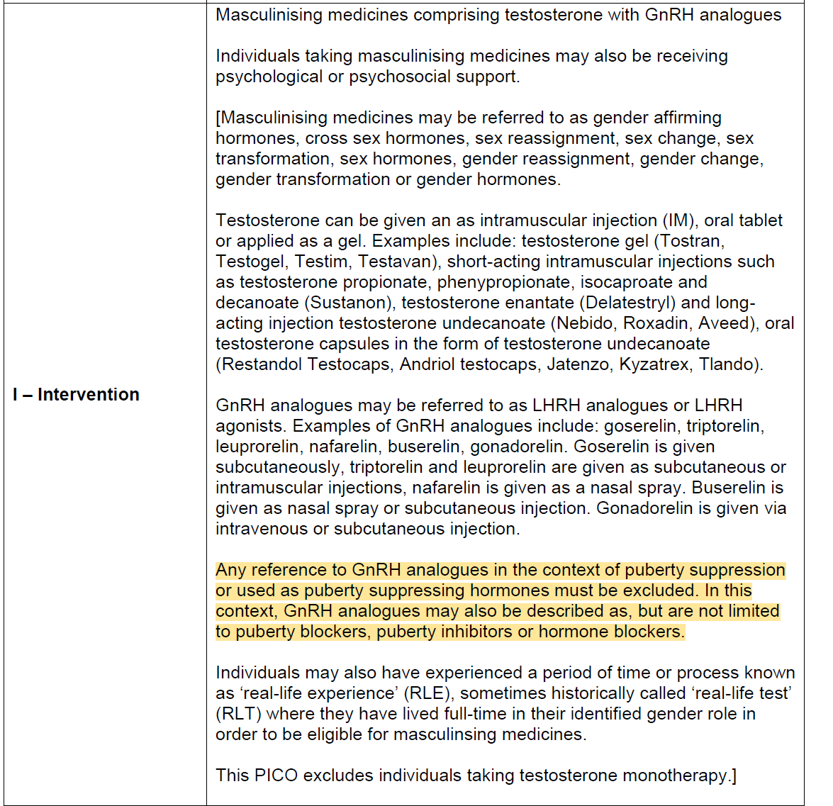 See the exclusion criteria for “Masculinizing medicines comprising testosterone with GNRH analogues”, which explicitly excludes any studies that reference GnRH analogues in the context of puberty suppression or used as puberty blockers: