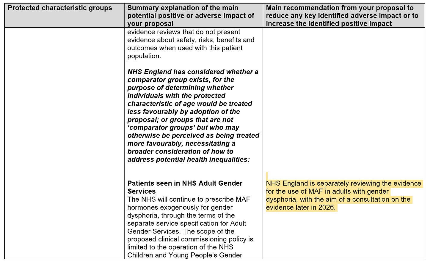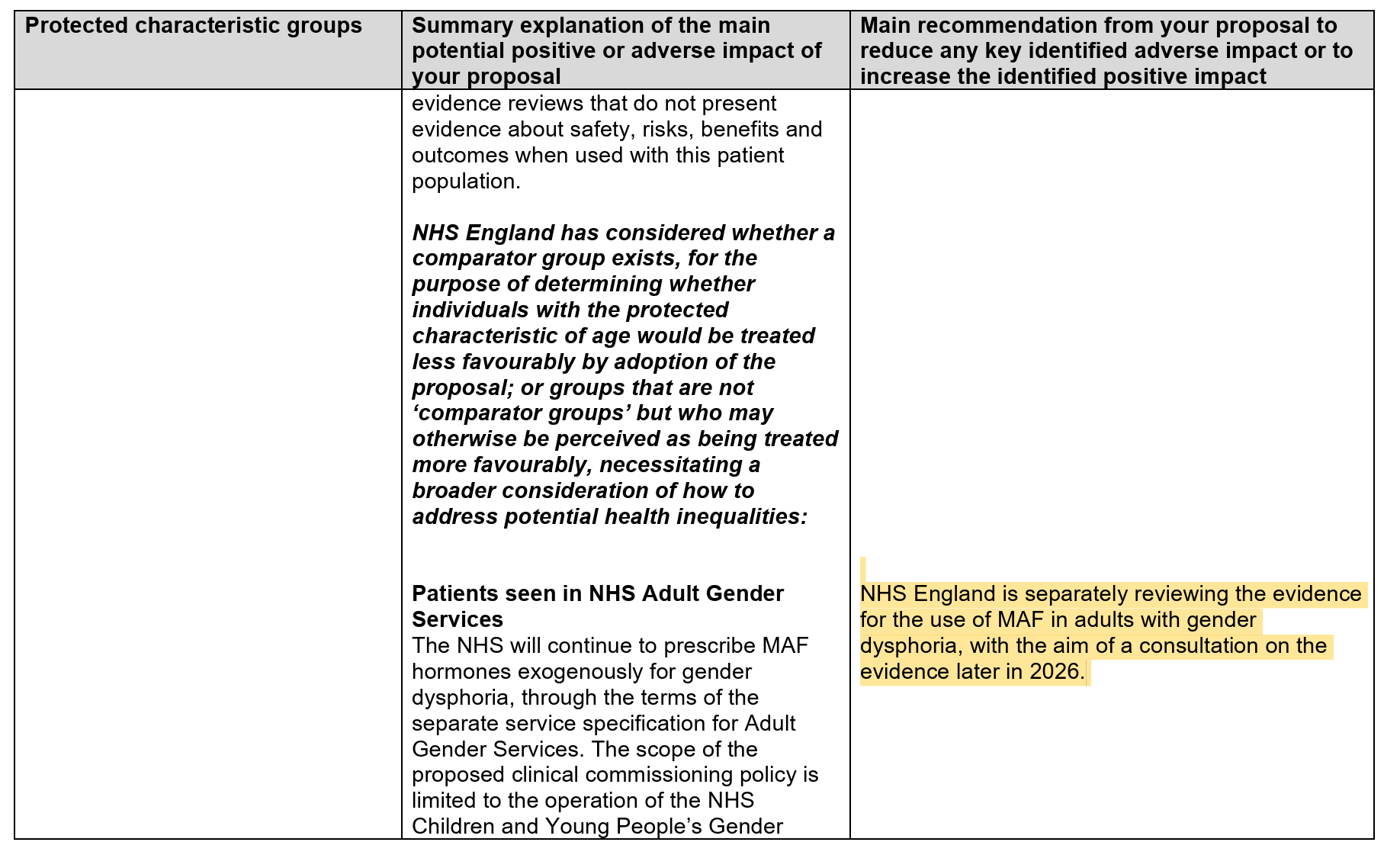 The studies were released alongside an announcement that NHS England would be pausing all new prescriptions for gender-affirming hormone therapy for people under the age of 18. This is a significant escalation in the United Kingdom, which had until now still allowed hormone therapy for 16- and 17-year-olds but had already instituted a ban on puberty-blocking medications in December 2024. Worse, buried in the equalities impact assessment accompanying the reviews, NHS England reveals that a similar process is already underway for adult care. The document states that NHS England is "separately reviewing the evidence for the use of MAF in adults with gender dysphoria, with the aim of a consultation on the evidence later in 2026." If that review follows the same methodology, it could be used to restrict or eliminate gender-affirming hormone therapy for trans adults in the UK as well.