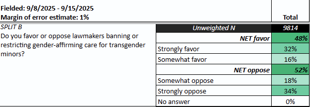 When asked whether lawmakers should ban or restrict gender-affirming care for transgender minors, 52 percent of Americans said they oppose such laws, while 48 percent said they favor them. The largest share—34 percent—“strongly oppose.” The result tracks with other surveys, including a March 2025 Data for Progress poll that found broad resistance to government bans on gender-related care for trans youth.