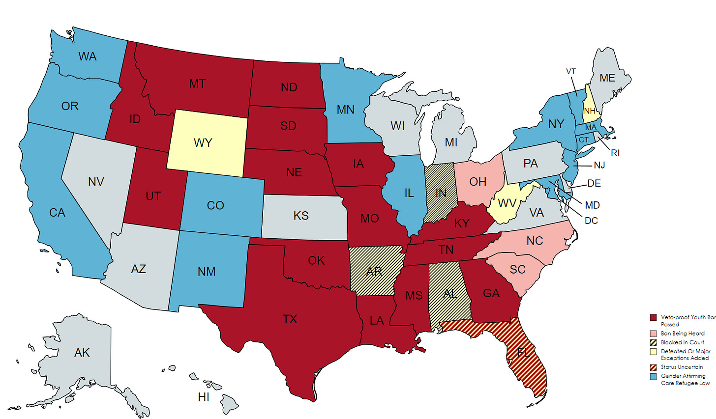 The United States currently has a patchwork of laws around gender affirming care for transgender youth. State borders spell the difference between care being explicitly protected and care being criminalized with hefty jail sentences. Judges orders further complicate the landscape, with several state laws now blocked in court. Some states have passed trans refugee protections, which explicitly protect transgender people fleeing other states and those obtaining care within the protective state borders. Other states have stayed out of the scare over gender affirming care for trans youth entirely. Here is the current map of laws targeting gender affirming care: