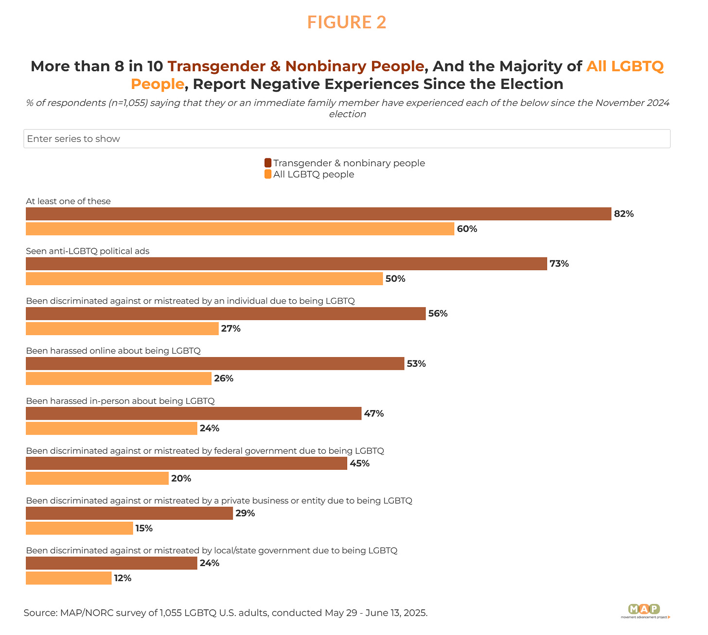 The likely reasons for this movement appear later in the survey. Transgender people report experiencing startling levels of discrimination in the aftermath of the 2024 election. More than half—56%—said they have faced discrimination because of their gender identity, while 47% reported being harassed in person. In many cases, that hostility is coming directly from the state itself: 24% of transgender respondents said they were discriminated against or mistreated by their local or state government. Faced with conditions like these, which can make even day-to-day life a struggle, relocation becomes less a choice than a means of survival.