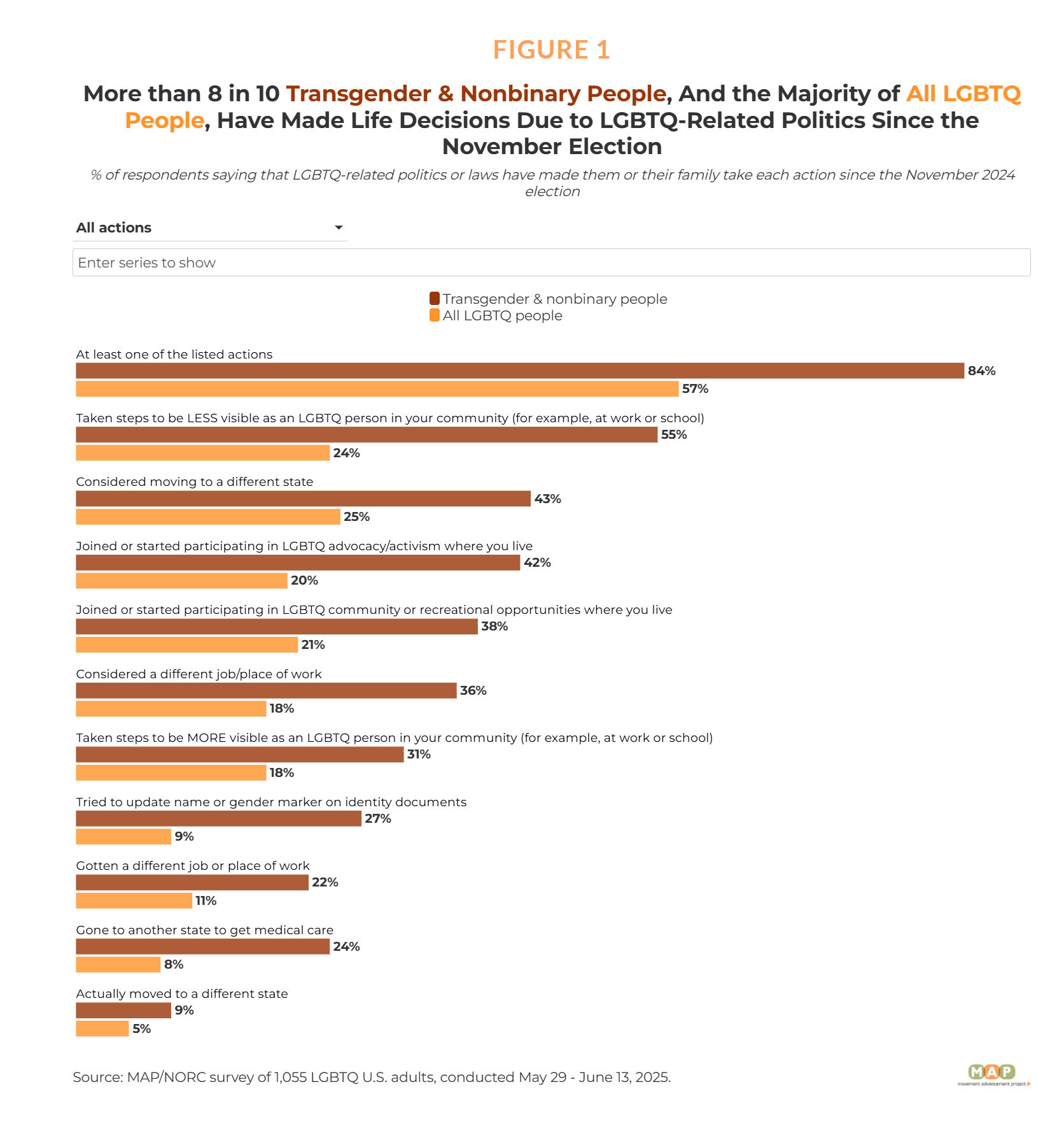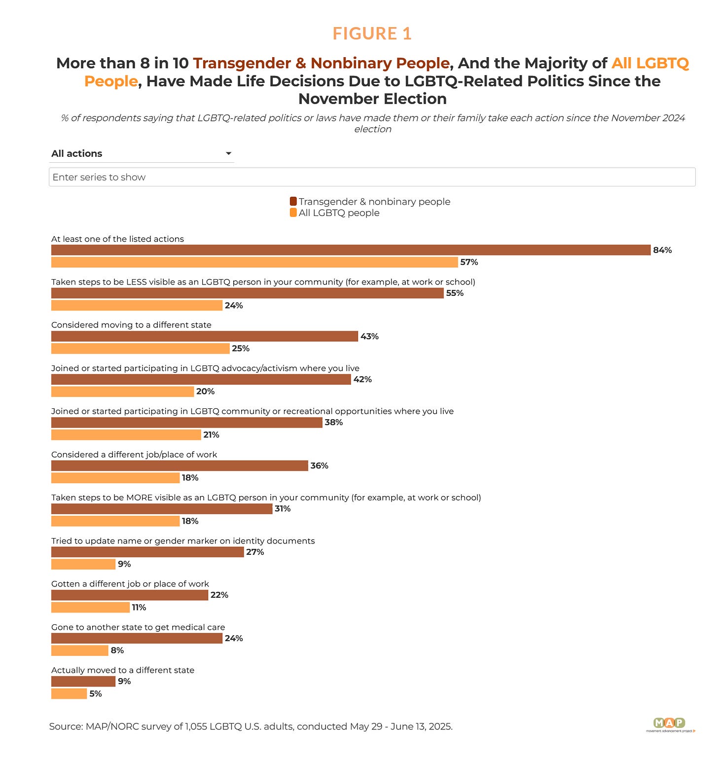 This is not the first survey to document this kind of movement. In 2023, Data for Progress examined transgender migration in the aftermath of harsh anti-transgender legislation passed at the state level, and found similarly large numbers of transgender people reporting that they had moved to a different state as a result. While the Movement Advancement Project survey focuses only on migration since the 2024 election, the broader pattern is clear: this migration has been underway for several years, and the true number of transgender people who have relocated in response to hostile policy environments is likely far larger than any single survey can capture.
