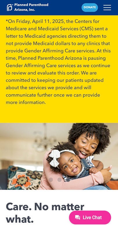 “At this time, Planned Parenthood Arizona is pausing Gender Affirming Care services,” the header reads. “We are committed to keeping our patients updated about the services we provide and will communicate further once we can provide more information.”
