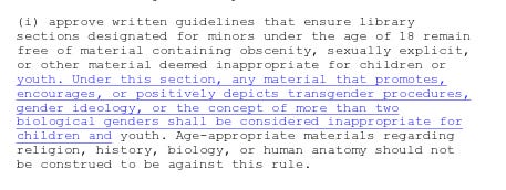 The proposal is buried in a section on explicit content and obscenity. Alongside pornography and graphic material, a new provision tells libraries what they cannot make available to anyone under 18. It reads (emphasis added): “Under this section, any material that promotes, encourages, or positively depicts transgender procedures, gender ideology, or the concept of more than two biological genders shall be considered inappropriate for children and youth.” In other words: positive depictions of transgender people are forbidden, while negative depictions remain perfectly acceptable.