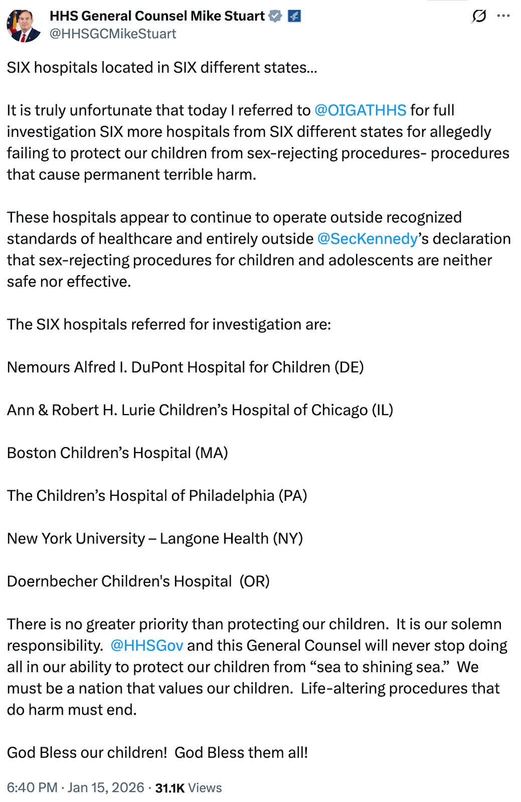 I hope Lurie Children’s Hospital is sued, and they decide fighting the suits costs more than complying with the administration does. Mike Stuart is one of those who should face a thorough, forensic examination of what he knew and said when, in his pursuit of monstrously abusing transgender people and youth. The people engineering, funding, and carrying out the propaganda campaign and enacting the laws and policies against transgender people must face 42 U.S.C. § 1983, 18 U.S.C. § 241, & 18 U.S.C. § 242 prosecution.