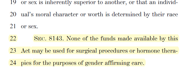 Crucially, a succinct three-line clause stipulates that none of the allocated funds can be utilized for hormone therapy or surgery for transgender military members, effectively cutting off their access to care, as all military members must seek healthcare through the military healthcare system unless otherwise authorized. Even if they can obtain authorization, for those stationed in states like Florida or internationally where healthcare for adults is heavily regulated or banned, their access to necessary care would disappear.