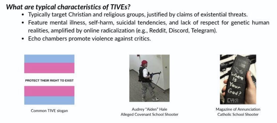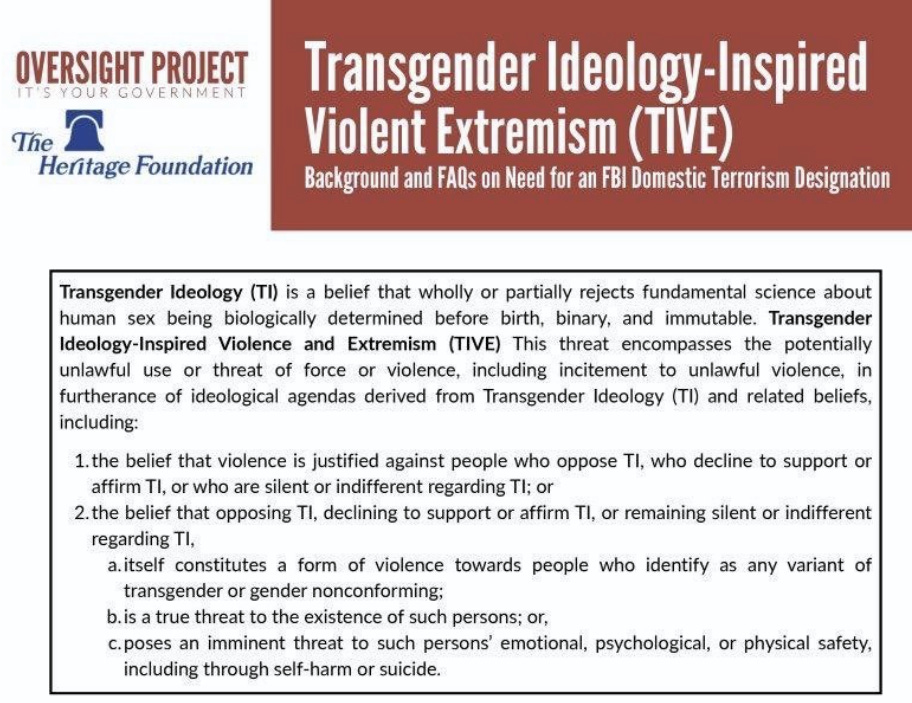 The memo’s first section lays out its definition of “Transgender Ideology-Inspired Violence and Extremism,” a term it urges the FBI to adopt as official doctrine. Under its test, anyone who believes violence is justified against opponents of “transgender ideology” would qualify. But the definition doesn’t stop there. It also includes anyone who argues that stripping away transgender rights constitutes violence or an existential threat to transgender people. That second prong is sweeping: by its logic, nearly every transgender rights activist or organization—merely for pointing out the tangible harm that comes from losing rights—would fall under the label of extremist.
