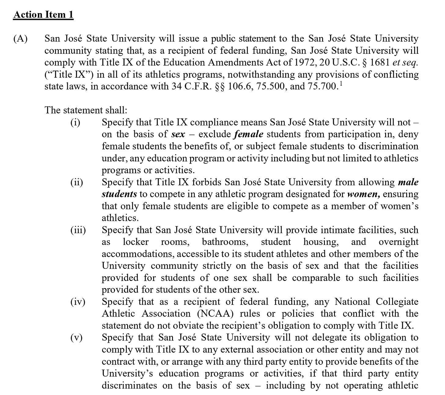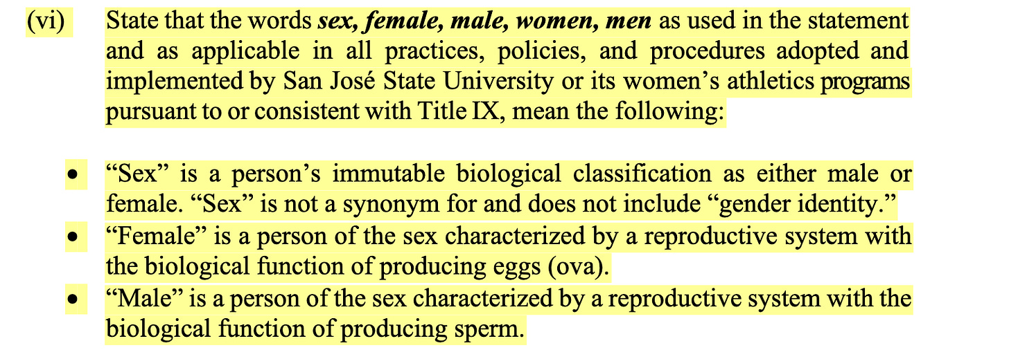 This lawsuit comes after over a year of legal back-and-forth, culminating in the OCR’s “Proposed Resolution Agreement,” which—among other provisions—requires SJSU to publicly agree that it violated Title IX, discriminate against trans athletes moving ahead, rebuke trans-inclusive language, and send out apology letters to presumed-cisgender athletes expressing “remorse” for welcoming trans student athletes.