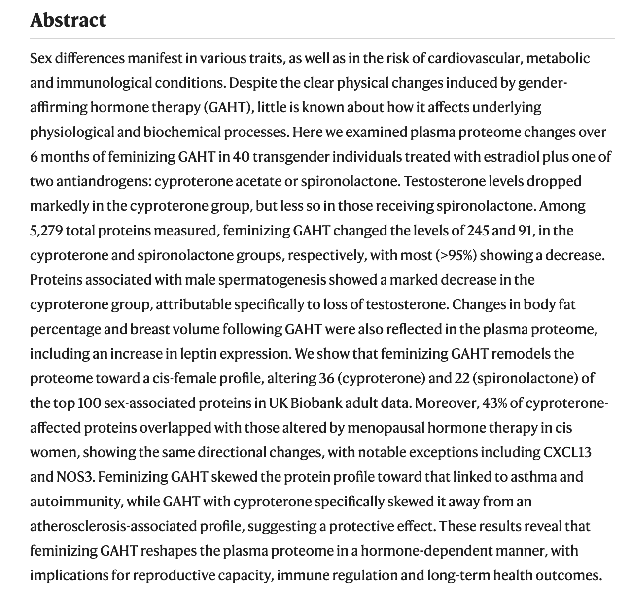 “Feminizing GAHT [gender-affirming hormone treatment] skews the plasma proteome toward a cis-female profile,” the study concluded.
