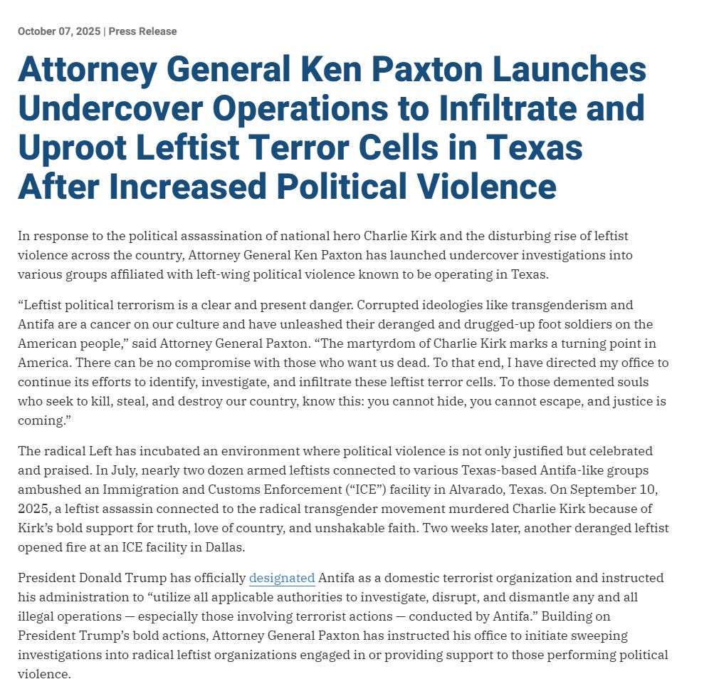 “In response to the political assassination of national hero Charlie Kirk and the disturbing rise of leftist violence across the country, Attorney General Ken Paxton has launched undercover investigations into various groups affiliated with left-wing political violence known to be operating in Texas,” the memo reads, “Leftist political terrorism is a clear and present danger. Corrupted ideologies like transgenderism and Antifa are a cancer on our culture and have unleashed their deranged and drugged-up foot soldiers on the American people… To that end, I have directed my office to continue its efforts to identify, investigate, and infiltrate these leftist terror cells. To those demented souls who seek to kill, steal, and destroy our country, know this: you cannot hide, you cannot escape, and justice is coming.”