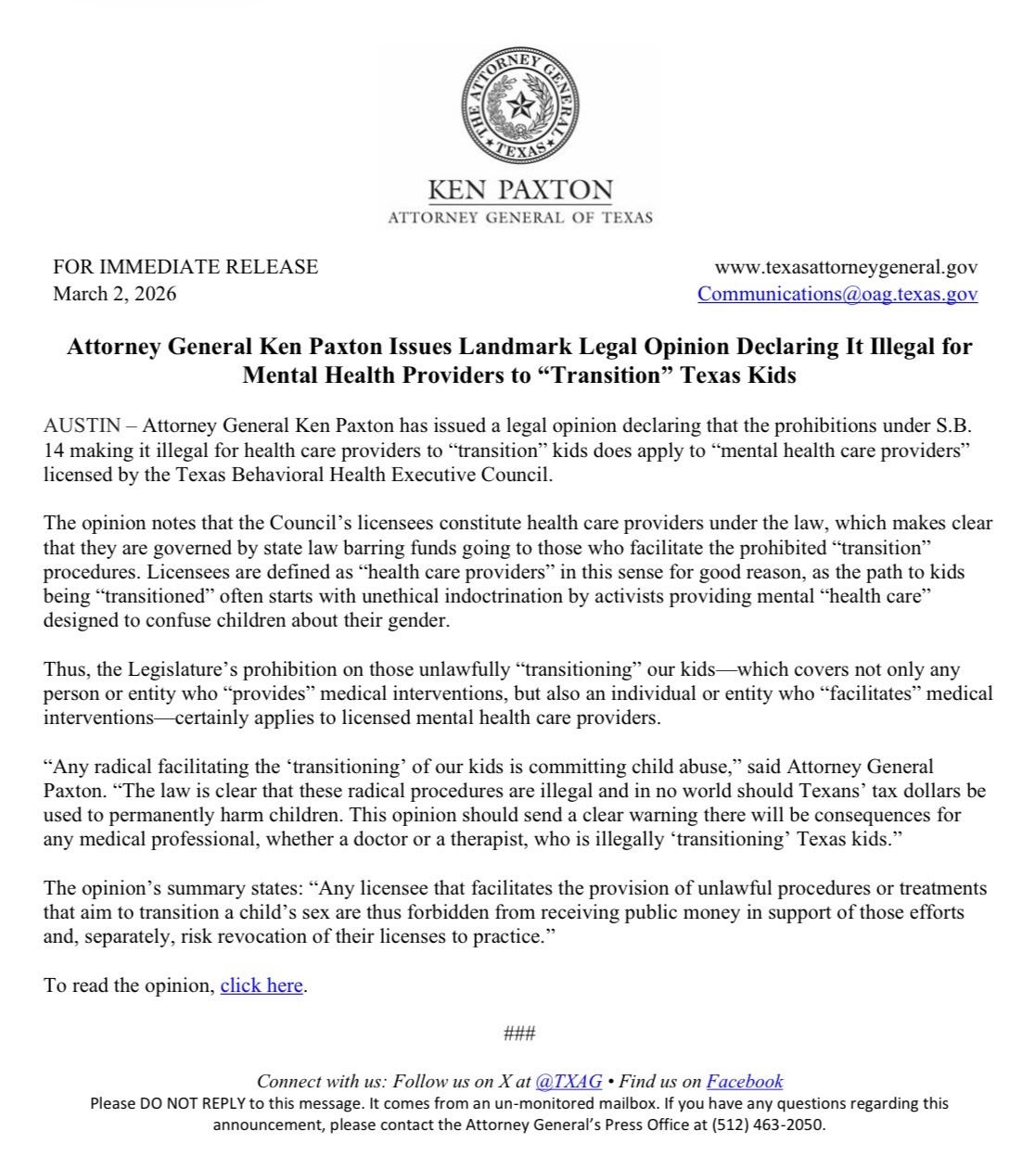 “Attorney General Ken Paxton has issued a legal opinion declaring that the prohibitions under S.B. 14 making it illegal for health care providers to ‘transition’ kids does apply to ‘mental health care providers’ licensed by the Texas Behavioral Health Executive Council,” says a press release issued by the attorney general’s office. The release describes therapists who affirm transgender youth as “activists providing mental ‘health care’ designed to confuse children about their gender,” and claims that the path to children being “transitioned” is actually “unethical indoctrination” and “child abuse.”