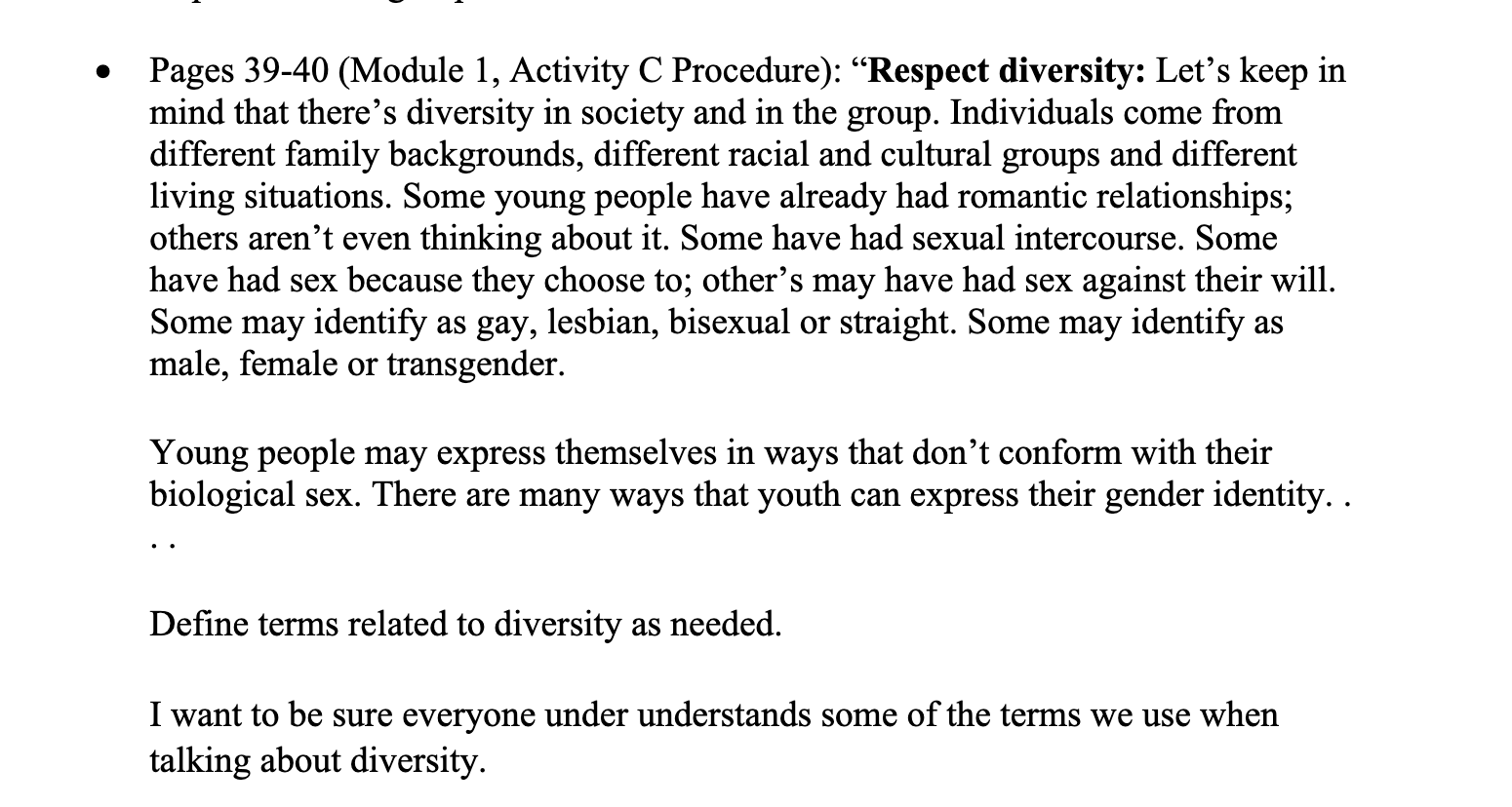 At the same time, the letters all cited a routine “medical accuracy review” that suddenly found the contested materials to be “outside of the scope of PREP’s authorizing statute at 42 U.S.C. § 71,” a decade after this law’s initial enactment. Flagged passages included discussions of LGBTQ communities as well as topics like consent or pre-marital sex.