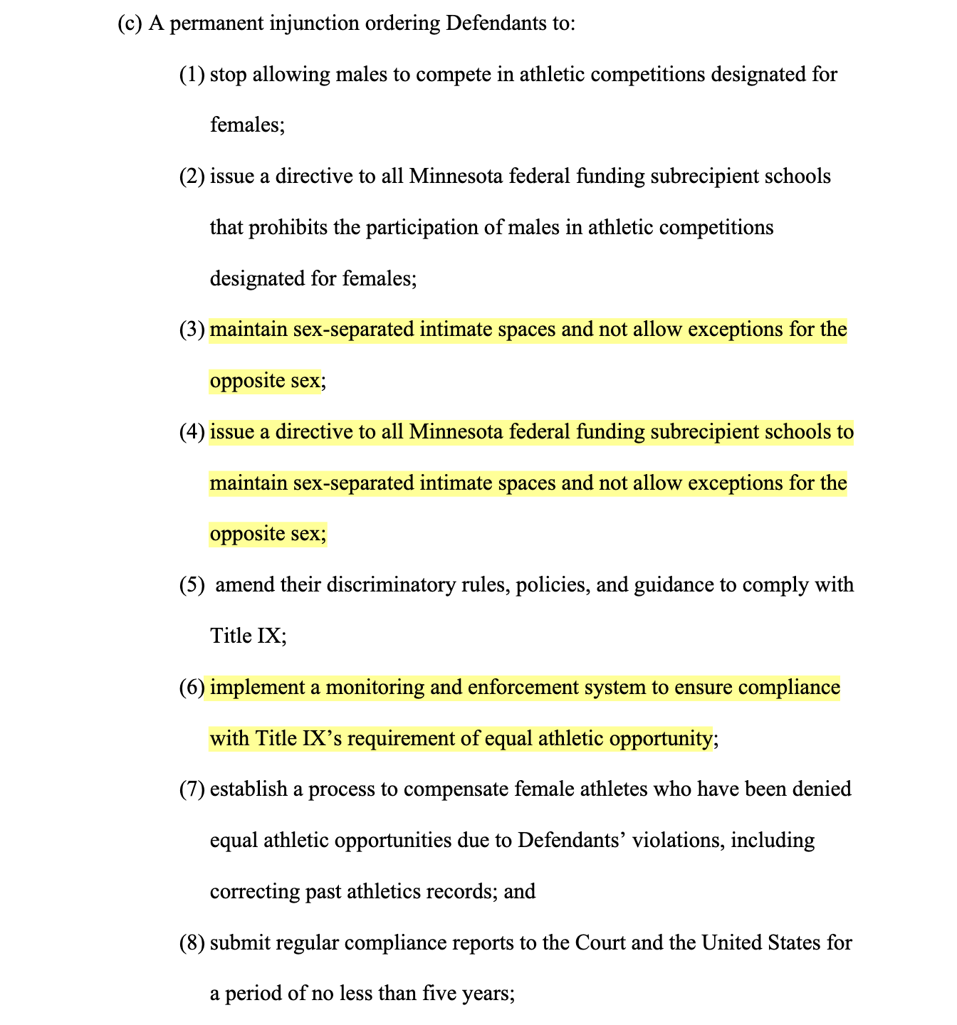 What they leave out, as they often do, is that the lawsuit goes far beyond sports. Instead, it is a political Trojan Horse—a vessel to carry out legally mandated trans segregation in bathrooms and locker rooms, colloquially known as a “trans bathroom ban,” and to redefine “sex” in the eyes of the law. Moreover, it targets the Minnesota Human Rights Act, arguing that the law “discriminates on the basis of sex against female students” in violation of Title IX.