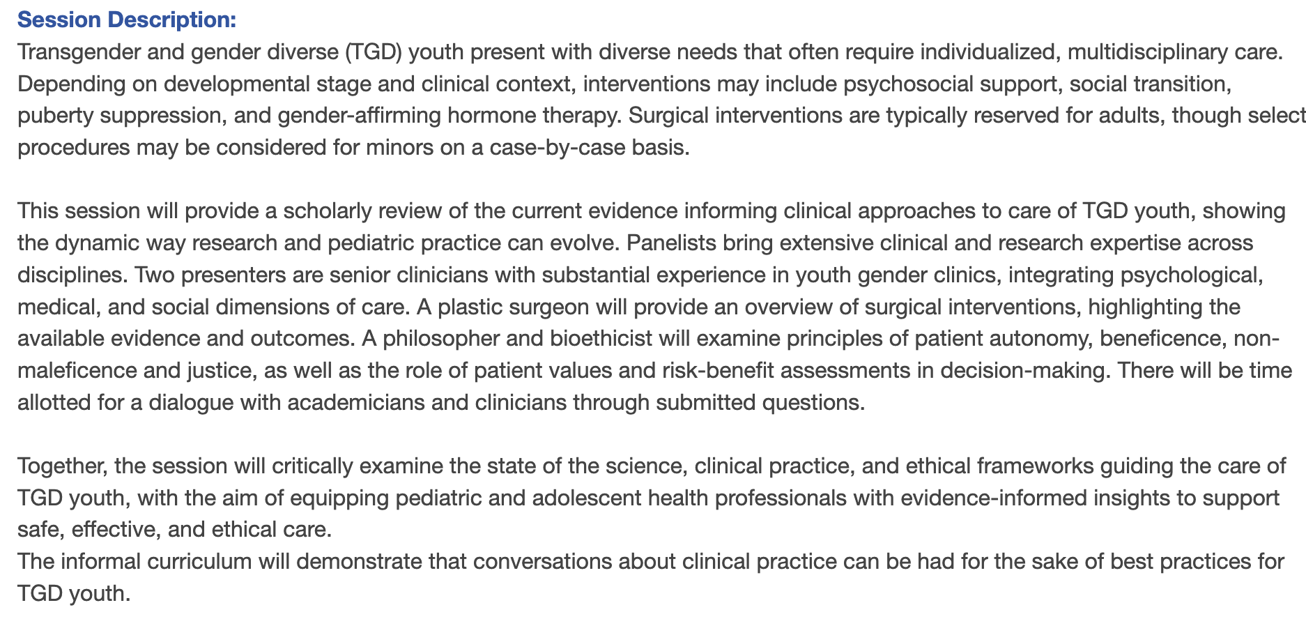 The panel looks innocuous enough on the conference schedule. “A Scientific Dialogue on the Care of Transgender and Gender Diverse Youth” is advertised as “a scholarly review of the current evidence informing clinical approaches to care.”
