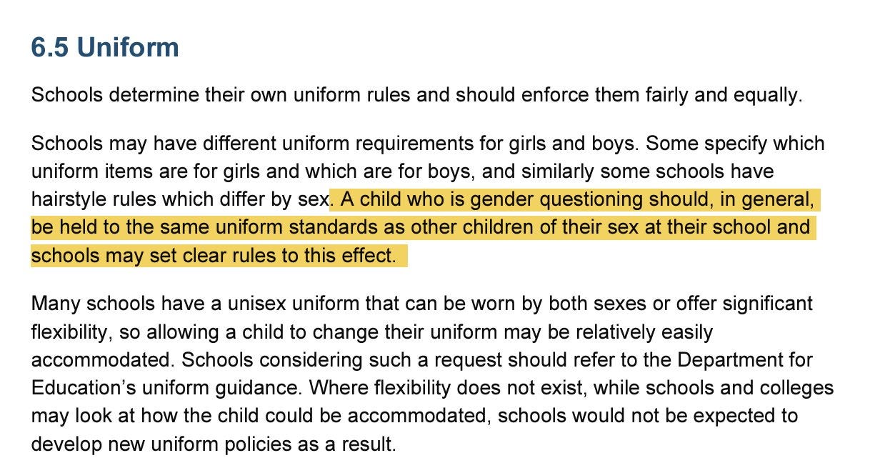 The UK release would allow for schools and colleges to make transition virtually impossible for students. It states that schools have no duty to allow social transition, even if their parents are fully supportive. Furthermore, trans students would be banned from bathrooms of their gender identity and teachers would have to out transgender students to their parents. The policies even allow schools to enforce uniform policies based on a student’s assigned sex at birth, explicitly stating that transgender students should follow the “hairstyle rules” of their assigned sex at birth. This would lead to trans girls being forced, for instance, to cut their hair short. You can see the policies here: