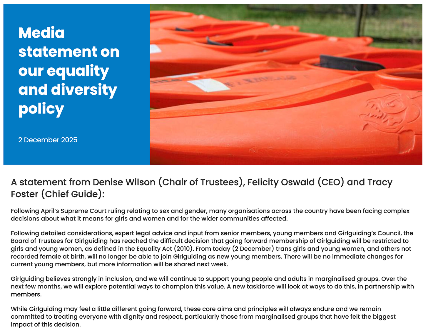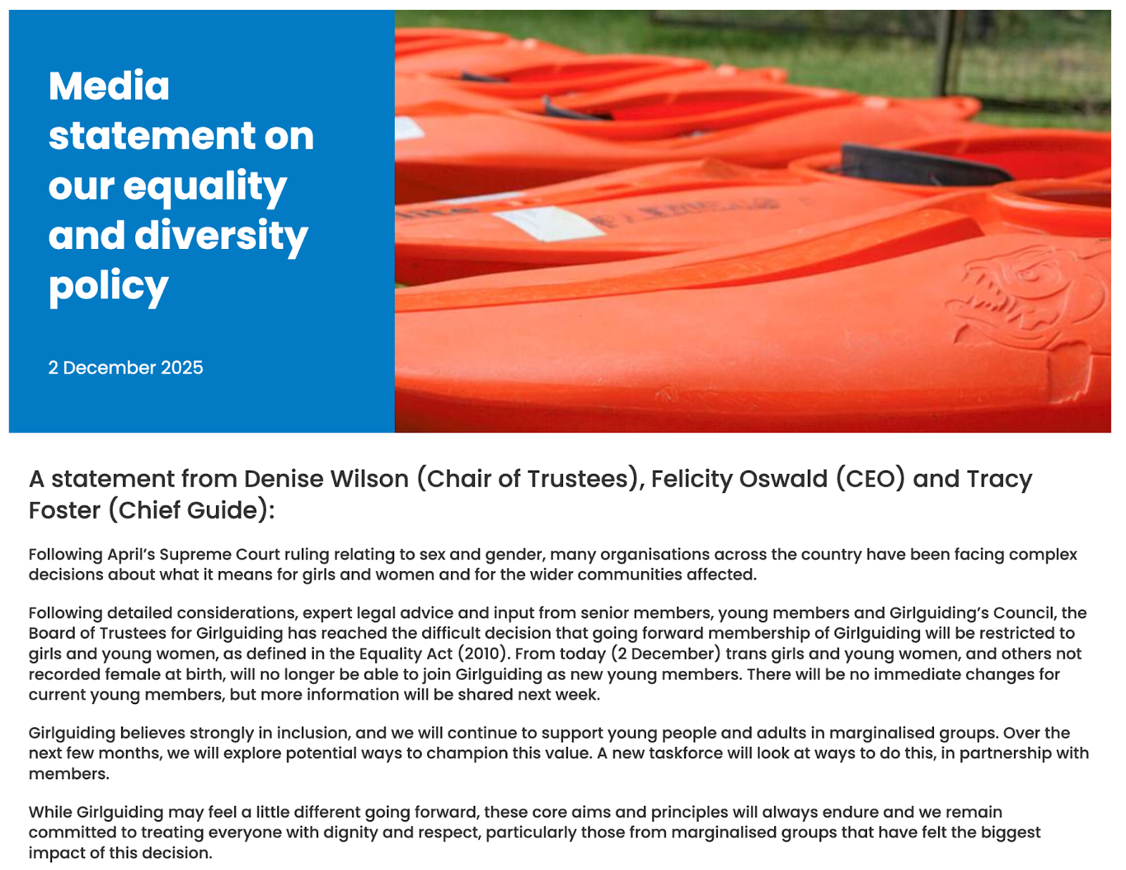 “Trans girls and young women, and others not recorded female at birth, will no longer be able to join Girlguiding as new young members.”