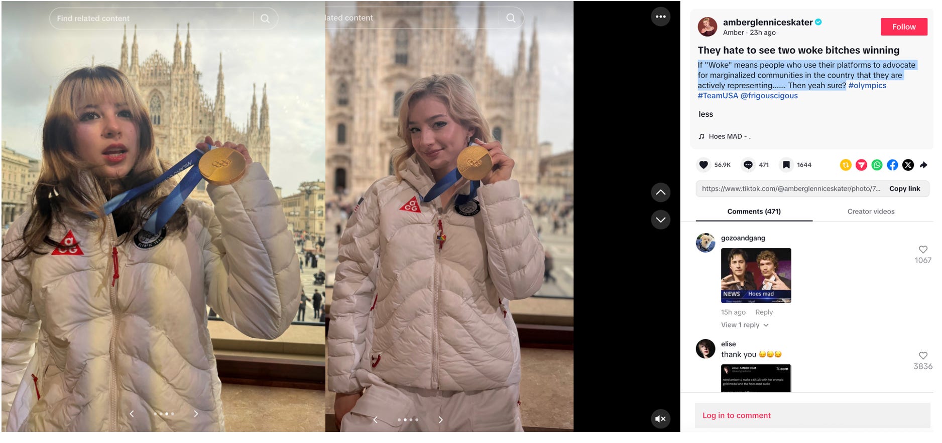 This weekend, Amber Glenn and her teammate Alysa Liu, targets of far-right fury for their progressive, pro-LGBTQ+ stances and their own queer identities, took home gold in the team figure skating event at the 2026 Winter Olympics. Glenn had already drawn a firestorm for a pre-Olympics press conference in which she spoke freely about Trump's attacks on the LGBTQ+ community, leading to death threats and a temporary retreat from social media. Now, after winning gold, Glenn returned to TikTok to post photos of herself and Liu with their medals, captioning the post, "they hate to see two woke bitches win," openly mocking conservative critics of their political activism.