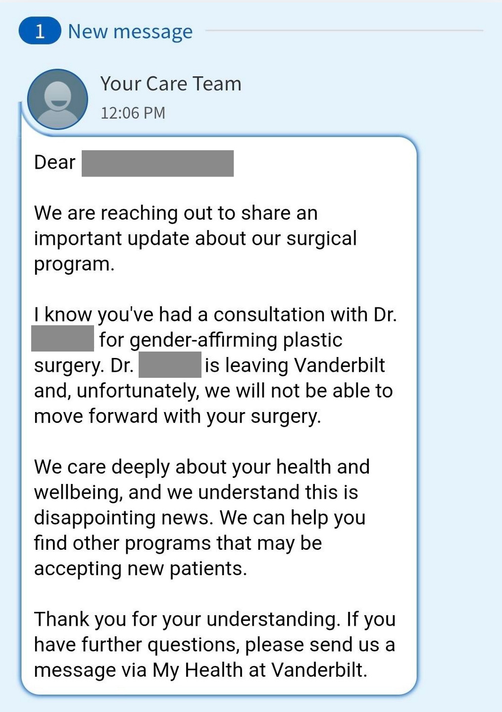 Meanwhile, patients started receiving updates via their medical portals, which cited the departure of the senior surgeon responsible for gender-affirming plastic surgeries.