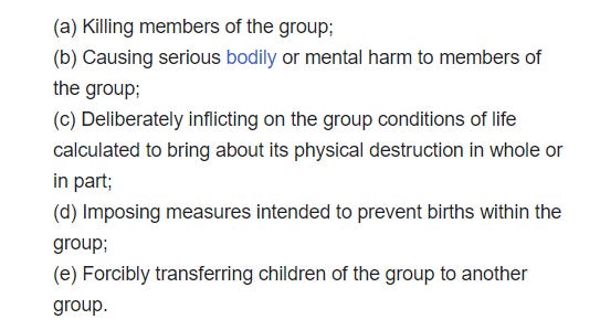 And although transgender people are not part of a “national, ethnic, racial, or religious group,” UN res 96/1 also includes “political” and “other” human groups in the definition. It is hard to look at these factors and think that they are not present in the treatment of transgender people - the banning of our medical care, banning of us from public spaces, banning our identity documents, and intentional targeting of us both legislatively and physically seems to match. The policies they are putting into place will absolutely increase suicide rates that are proven to be lowered by things like gender affirming care and identification documents. The rhetoric will cause more violence against us.