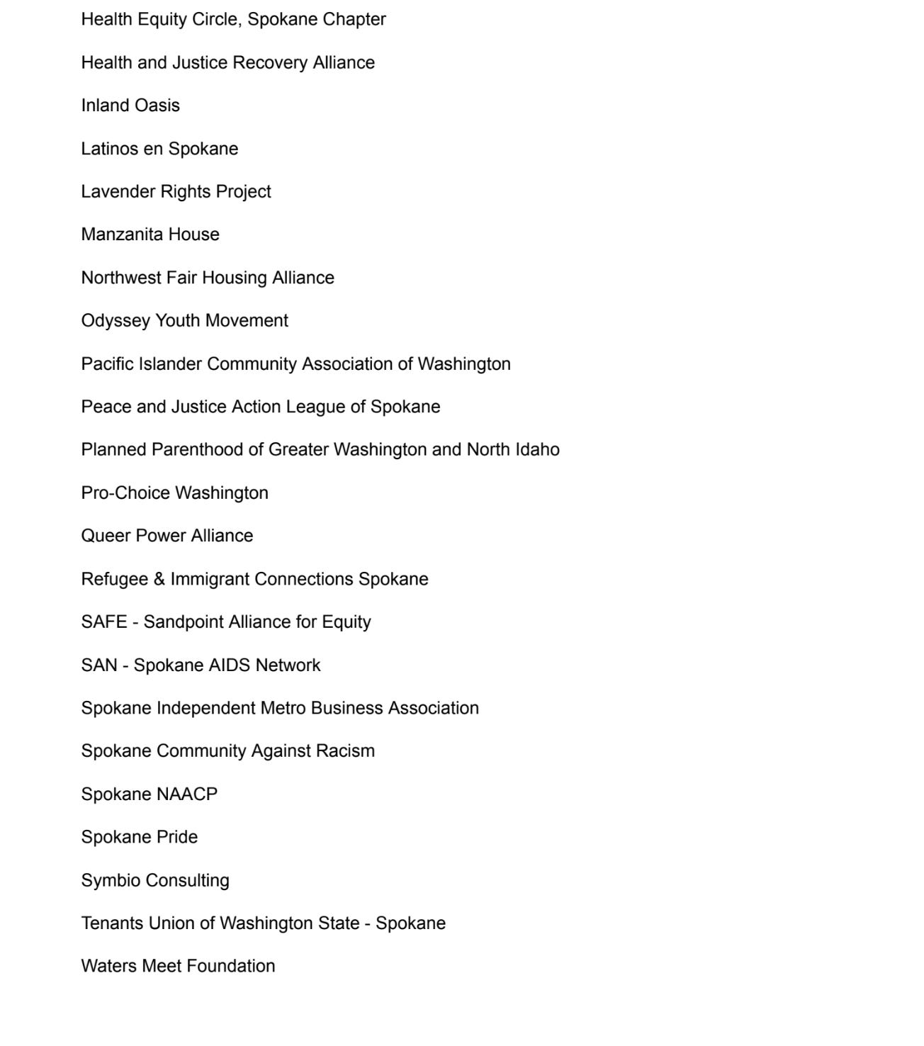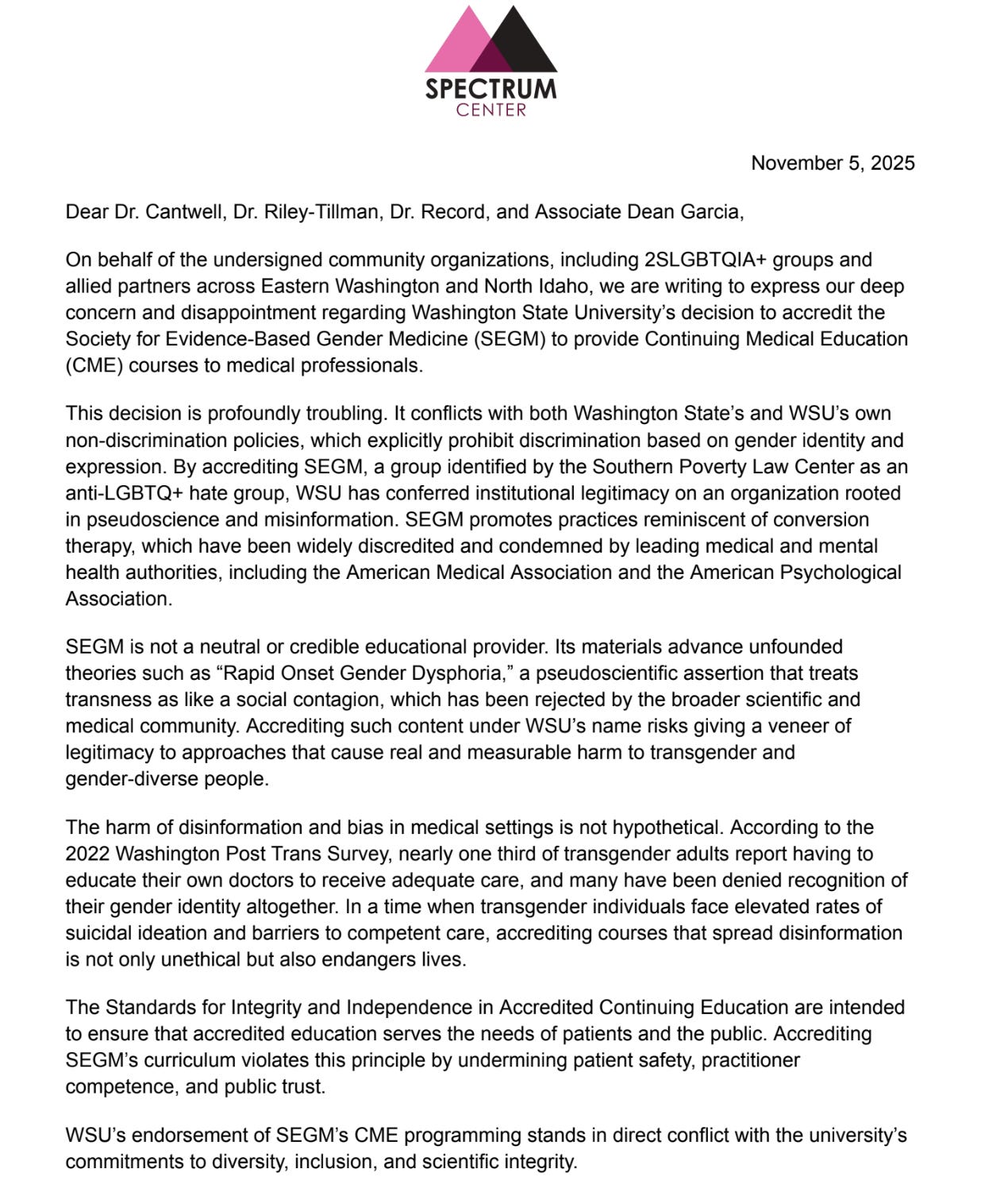 An open letter was penned by Spectrum Center Spokane, and co-signed by groups like Spokane Pride, the Greater Seattle Business Association (Washington’s LGBTQ+ & Allied Chamber of Commerce), and local chapters of the NAACP and Planned Parenthood. This is in addition to the hundreds of people who have already written to WSU leadership about the fiasco as of Nov. 5, Spectrum told Erin in the Morning.