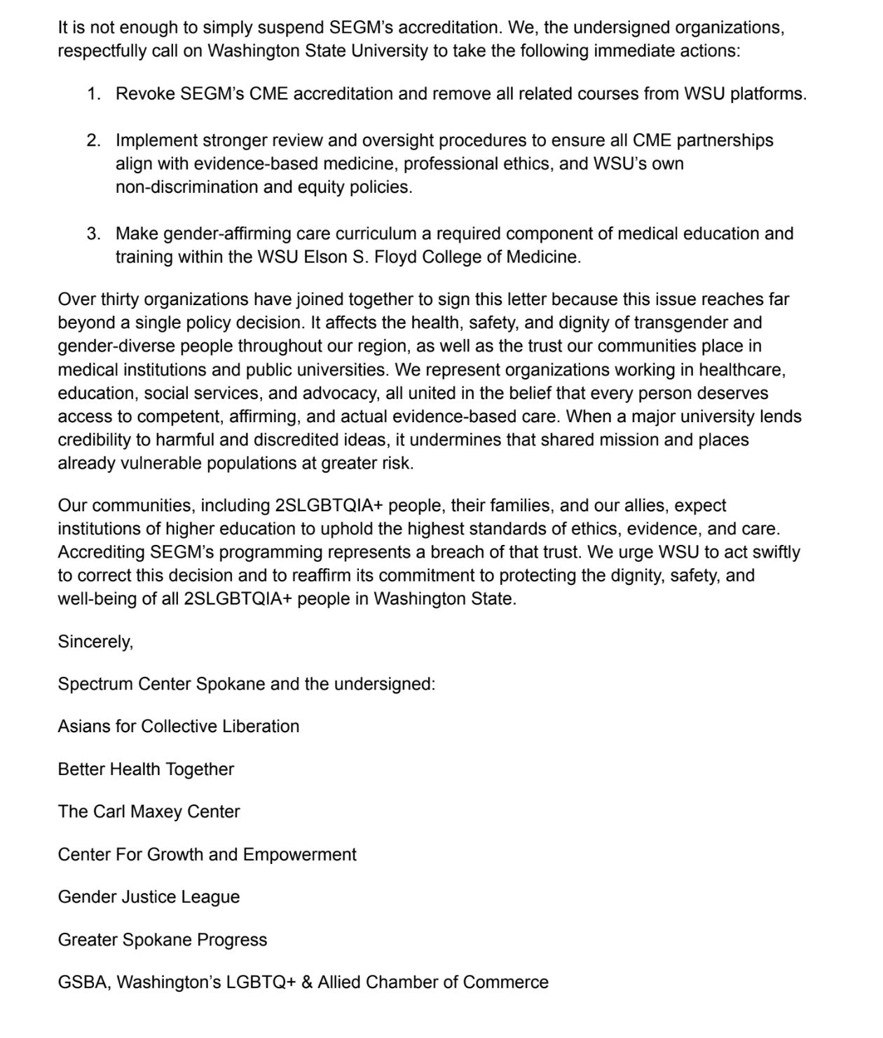 Among the group’s demands is a mandatory gender-affirming care curriculum for medical students and “stronger review and oversight procedures to ensure all CME partnerships align with evidence-based medicine, professional ethics, and WSU’s own non-discrimination and equity policies.”
